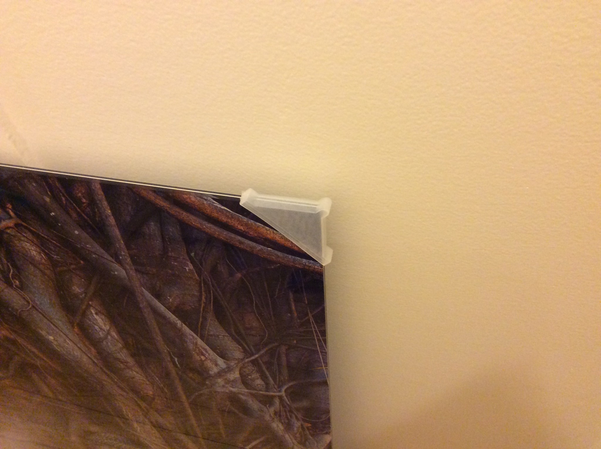 Au niveau du support, la découpe est nette et la structure solide. Deux solutions sont prévues pour l’accroche, une corde métallique permet de le suspendre et deux trous permettent de le poser sur des clous, à vous de choisir. Attention tout de même, la structure est lourde (4,1 kg pour le contrecollé alu dibond plexi 60 x 90), ne l’accrochez pas au dessus d’un lit ou alors avec de bonnes fixations.