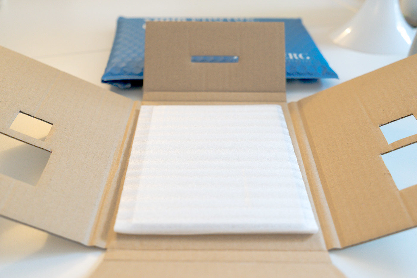 Le Mini est expédié dans une enveloppe protectrice aux couleurs de LabKorner. À l’intérieur, un carton protège l’ensemble et contient le Mini, le support en plastique et la fixation murale 3M non montée. Le tirage est protégé par une pochette en papier mousse bien calée dans l’emballage en carton.