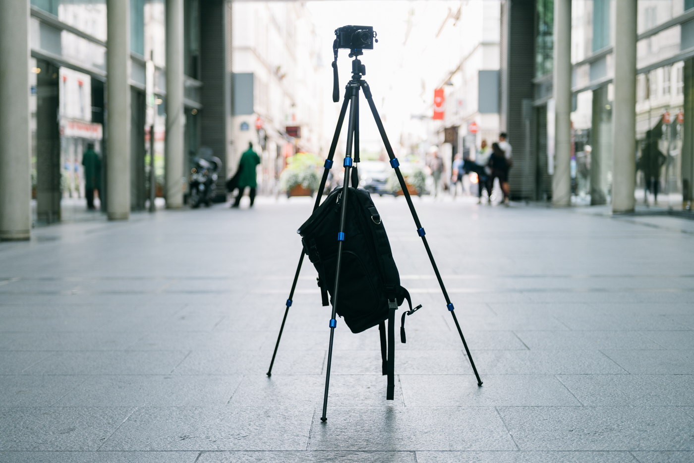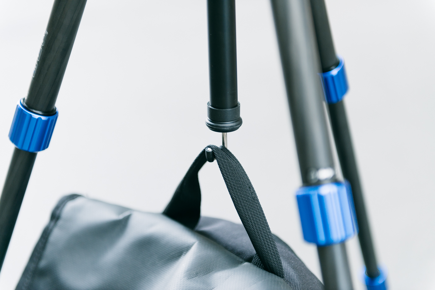La colonne centrale est assez fine pour accueillir autour d’elle les pieds repliés, et possède à son extrémité un crochet pour accrocher une charge, afin d’accroitre la stabilité de l’ensemble. Le crochet est démontable pour retourner la colonne centrale, et se rapprocher ainsi du sol, pour la macro par exemple.