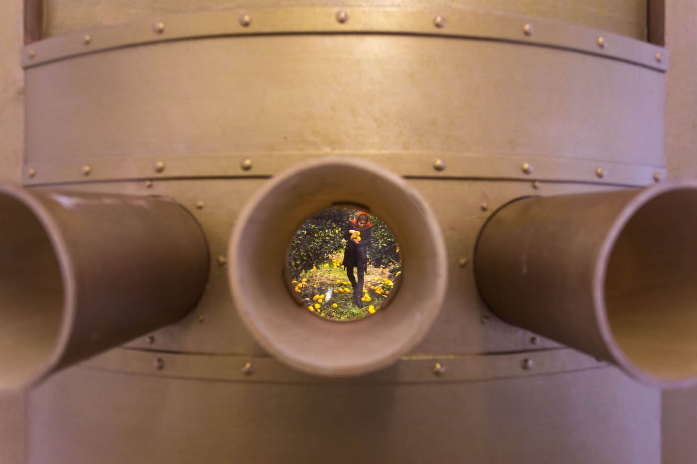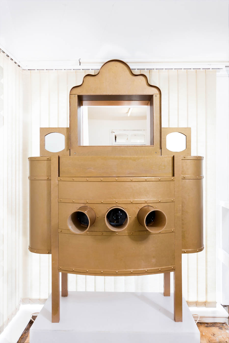 C’est à travers un « Peep Box » que l’on peut admirer ces photographies. Cet appareil ancien permet de visualiser les clichés par des petites ouvertures dans une boîte. « Shahre Farang » est également le nom du Peep Box en Orient. Le photographe nous raconte l’histoire de ce concept : « Le roi Mozaffar a assisté à une exposition internationale à Paris au 19e siècle où il a vu une sorte de boîte de peep et il a décidé d’en avoir une en Iran, évidemment avec des dessins persans. »