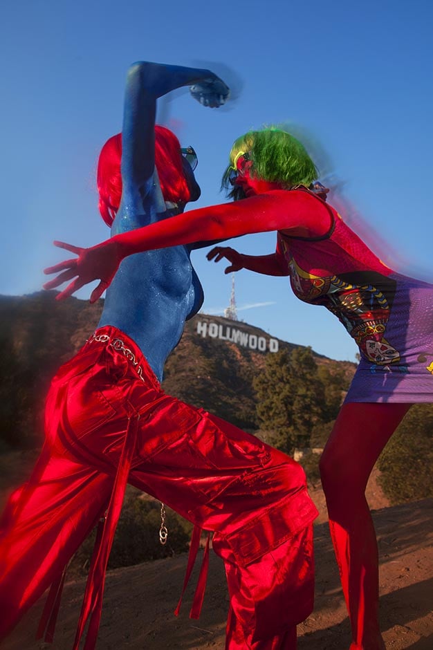 Des femmes à la peau pailletée bleue, verte, rouge ou violette qui ont un air de Warhol font leur course et leur road-trip à Hollywood dans l’hystérie. Les rendant plus visibles dans des compositions surchargées de couleurs pop et acides, leur maquillage corporel et leur perruque camoufle pourtant leur identité.