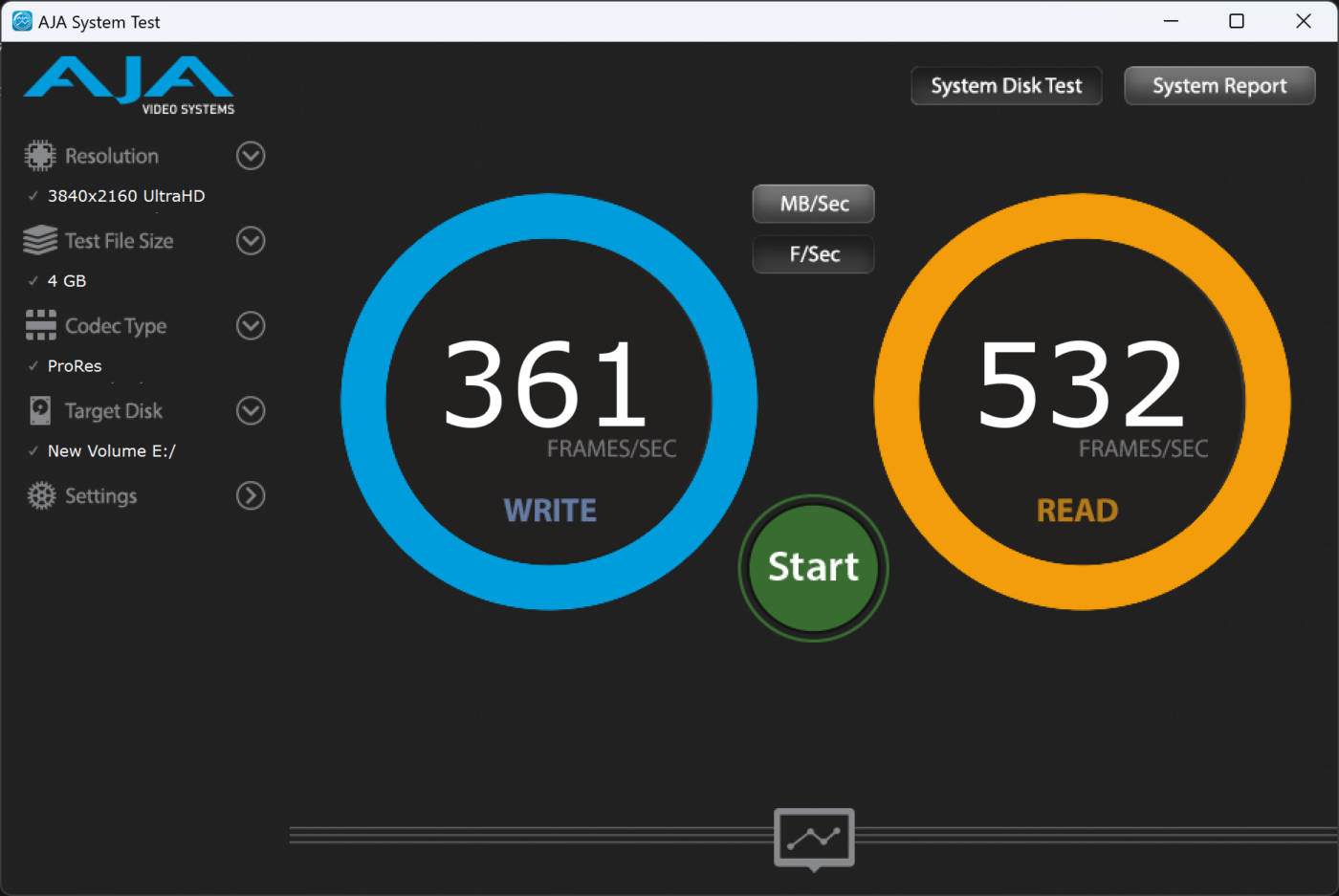 Avec le logiciel AJA System Test, nous avons pu établir les framerates maximales théoriques que la carte pouvait encaisser en vidéo. Ici, en 4K UHD et Apple ProRes, la CFexpress de Type A Pergear Master peut encaisser un maximum de 361 fps. Un chiffre bien supérieur à la moyenne des cartes classiques et qui tend à prouver la rapidité des cartes 4.0.