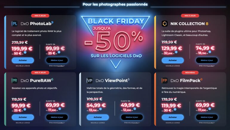Pour le Black Friday 2025, DxO applique de fortes remises sur l’ensemble de ses logiciels photo : PhotoLab 9, PureRAW 5, Nik Collection 8, FilmPack 8 et ViewPoint 5. Bonne nouvelle : ces promos concernent aussi bien les nouvelles licences que les mises à jour depuis les versions précédentes.