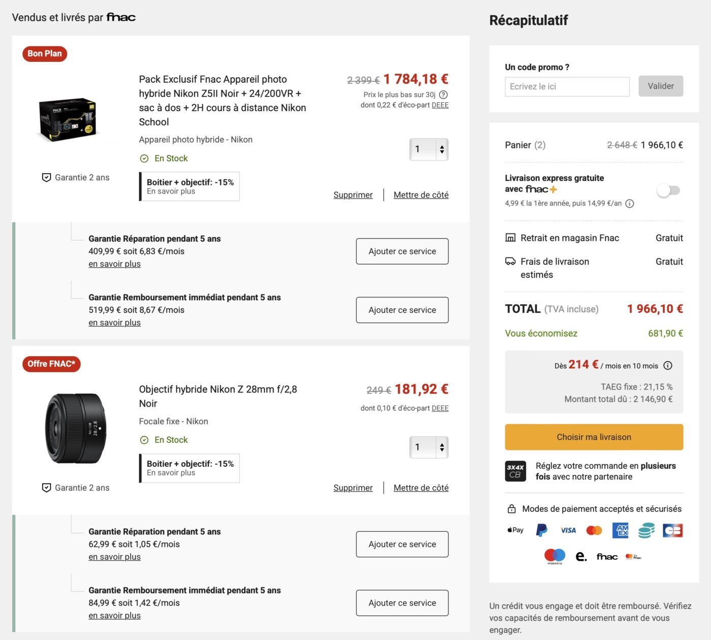 Côté Nikon, l’excellent hybride Nikon Z5 II en kit avec un zoom 24-200 mm, un sac rolltop et une formation de 2h passe à 2099 €. Ajoutez la petite focale fixe Nikkor Z 28 mm f/2,8, idéale pour la street photo et en voyage, proposé à 181 € au lieu de 249 € : l’ensemble passe à 1966 € – soit un tarif inférieur à celui du pack initial, sans l’objectif 28 mm supplémentaire !