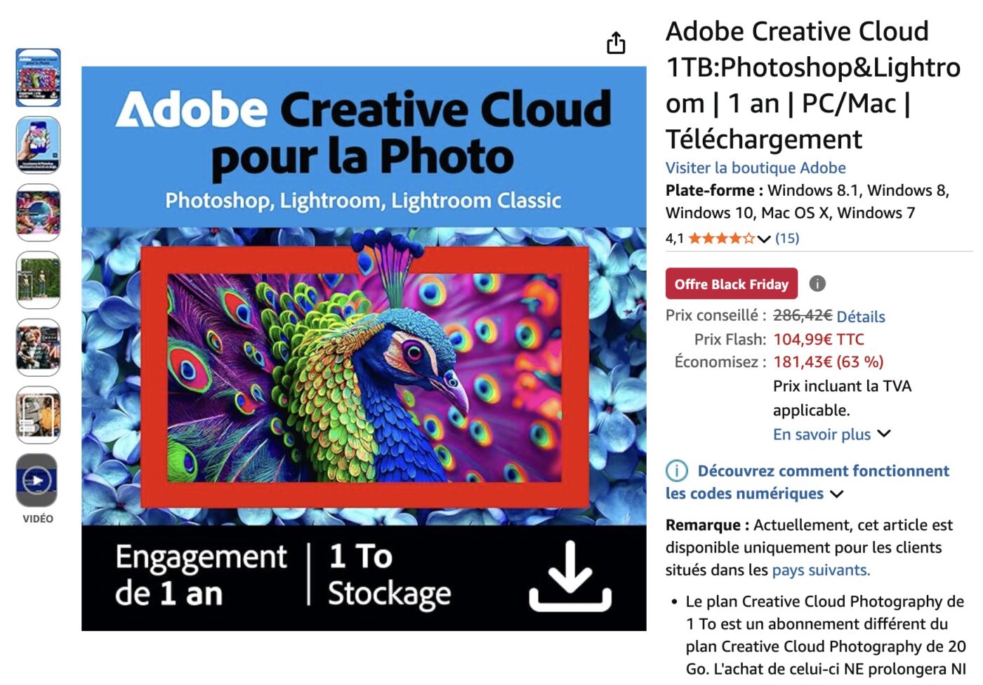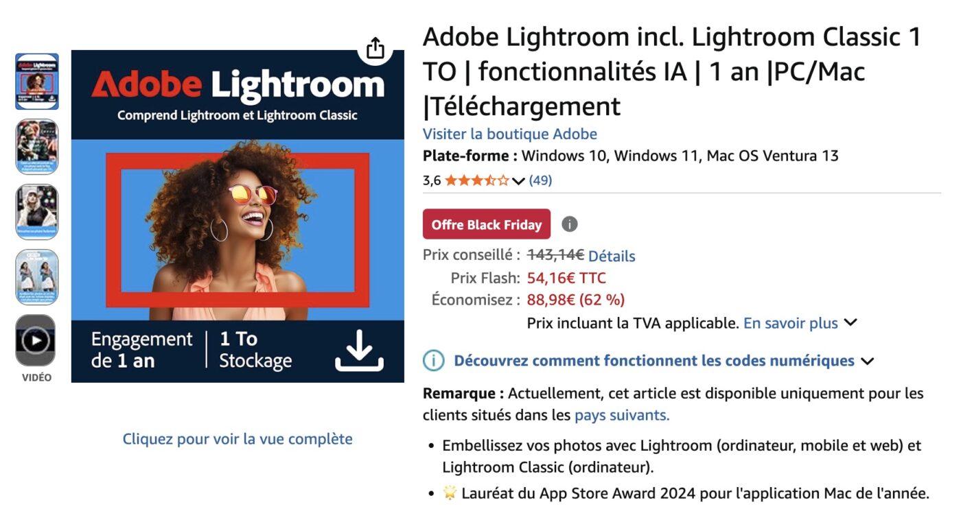 Pour ceux qui n’ont besoin que de Lightroom (et Lightroom Classic), Amazon propose l’offre la plus intéressante, avec une remise de 62%, soit l’abonnement 1 an au prix de 54,16 € au lieu de 143,14 €. Attention, cette offre n’intègre pas Photoshop, mais permet de disposer d’un stockage en ligne confortable pour stocker ou synchroniser ses photos.