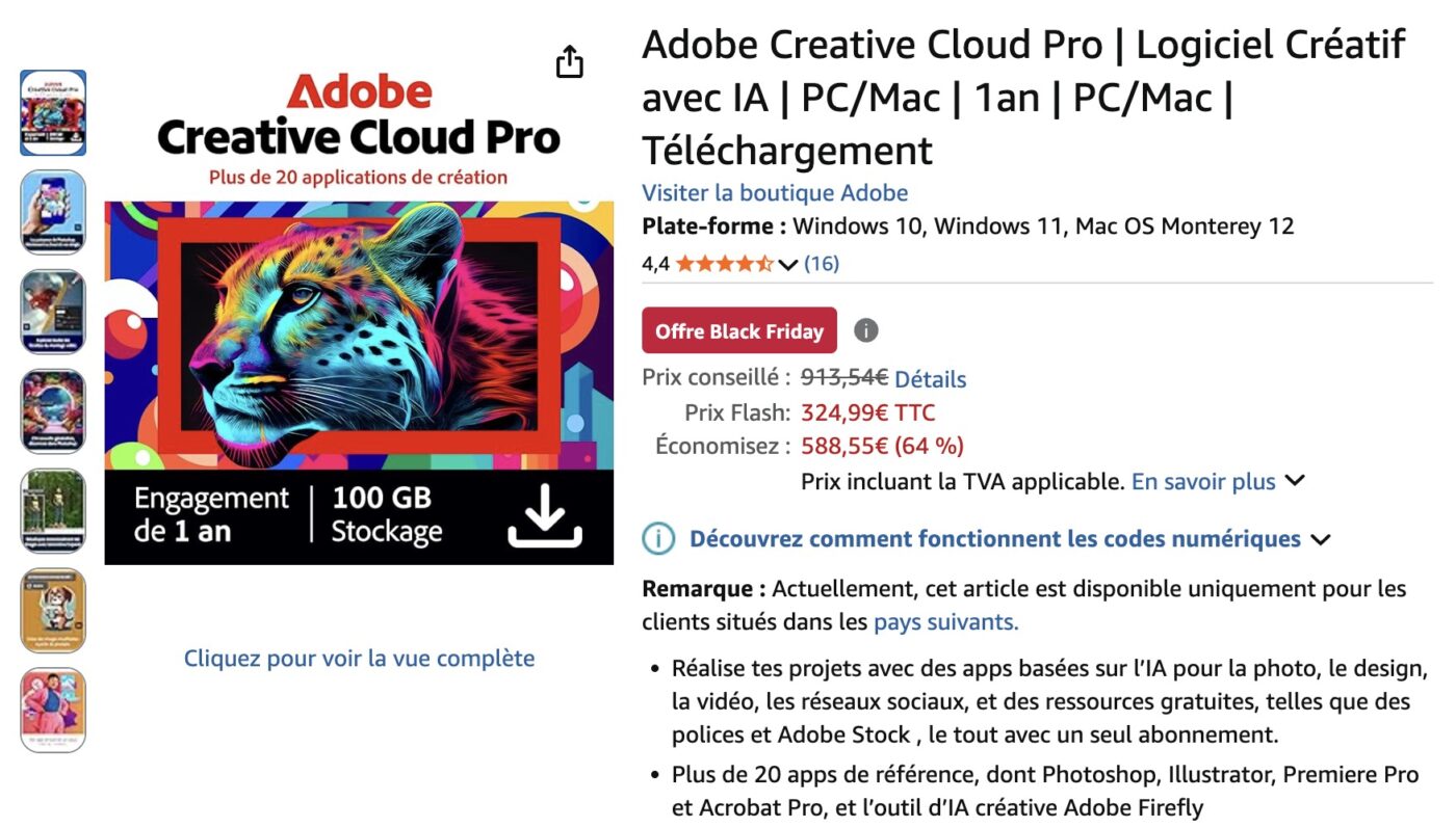 Amazon propose aussi une excellente promotion sur l’abonnement Adobe Creative Cloud Pro (anciennement All Apps), qui donne accès à l’ensemble des logiciels Adobe – Lightroom, Photoshop, Illustrator, Premiere Pro, After Effects, et bien d’autres – ainsi qu’aux outils d’IA générative Firefly.