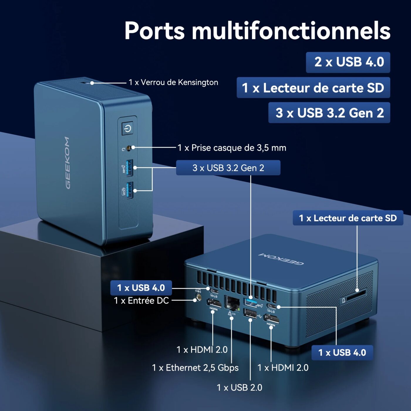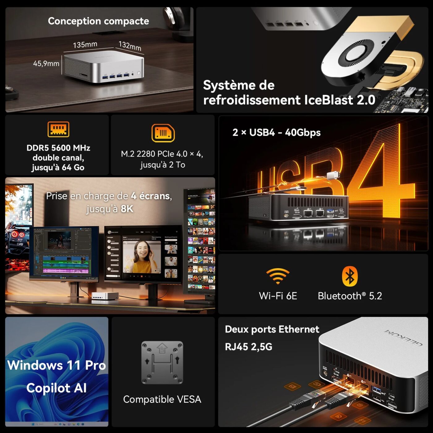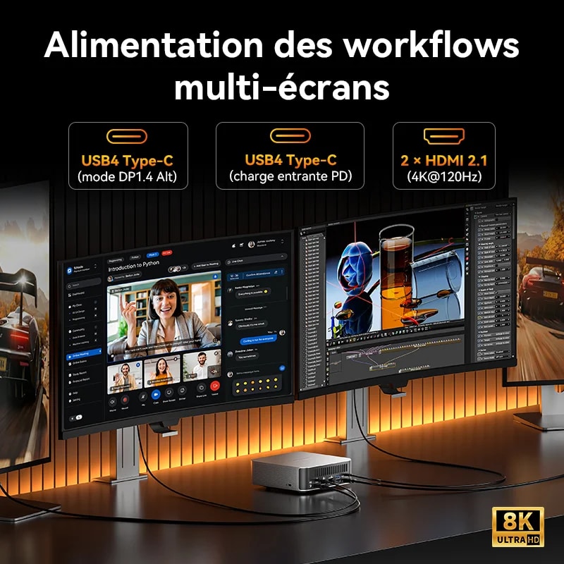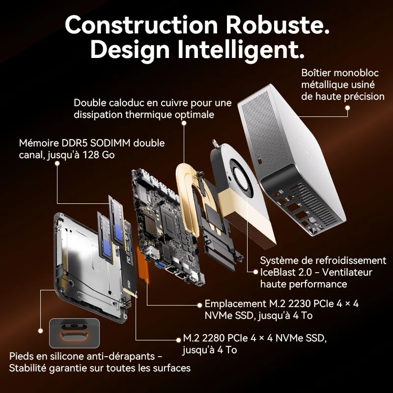 Associé à une RAM DDR5 jusqu’à 128 Go, un SSD PCIe 4.0 jusqu’à 8 To et une connectique complète (Wi-Fi 7, double LAN 2,5 G, USB4, 2x HDMI 2.1), ce mini-PC condense les performances d’une station de travail dans un format compact — idéal pour les créatifs, ingénieurs, ou professionnels en quête de puissance et de mobilité.