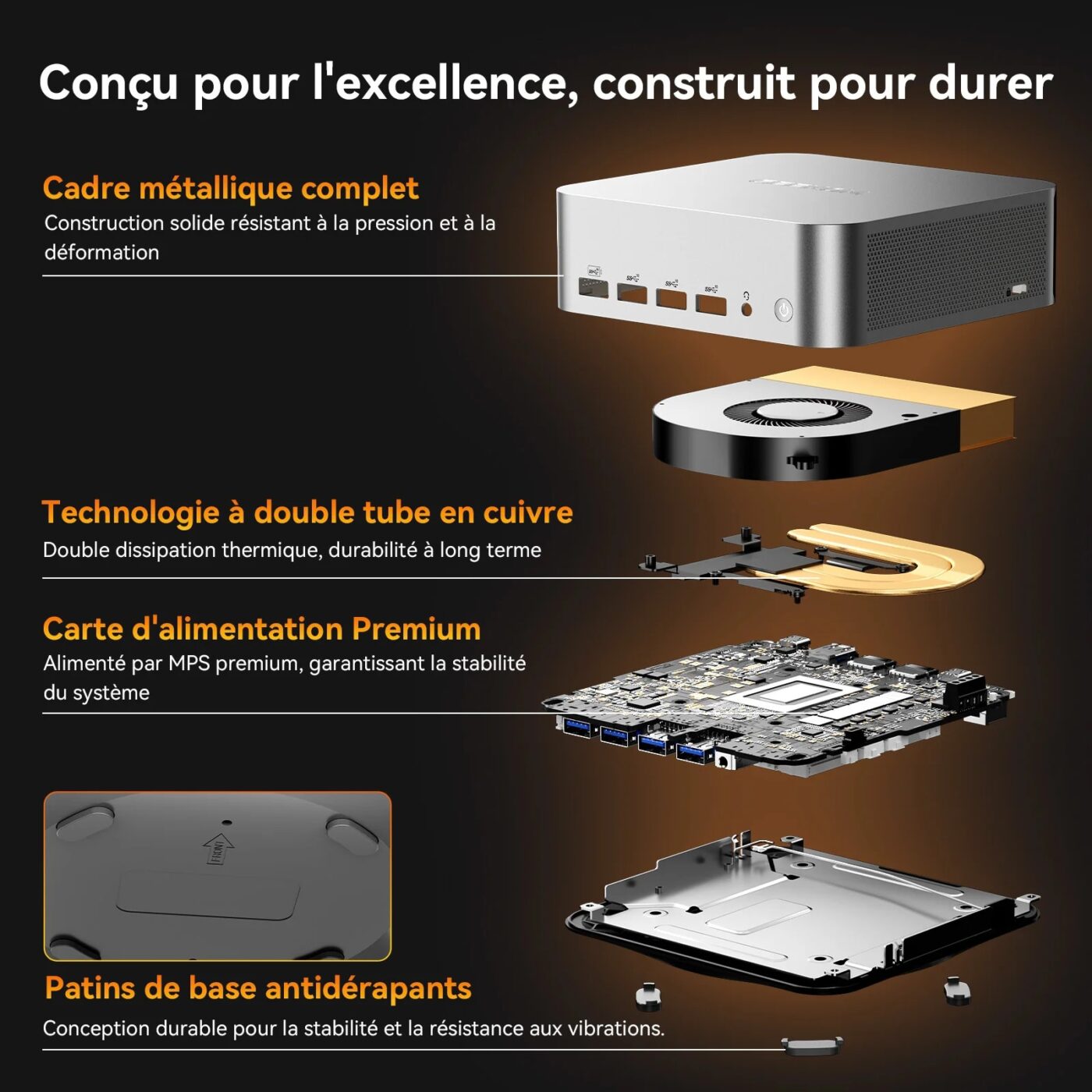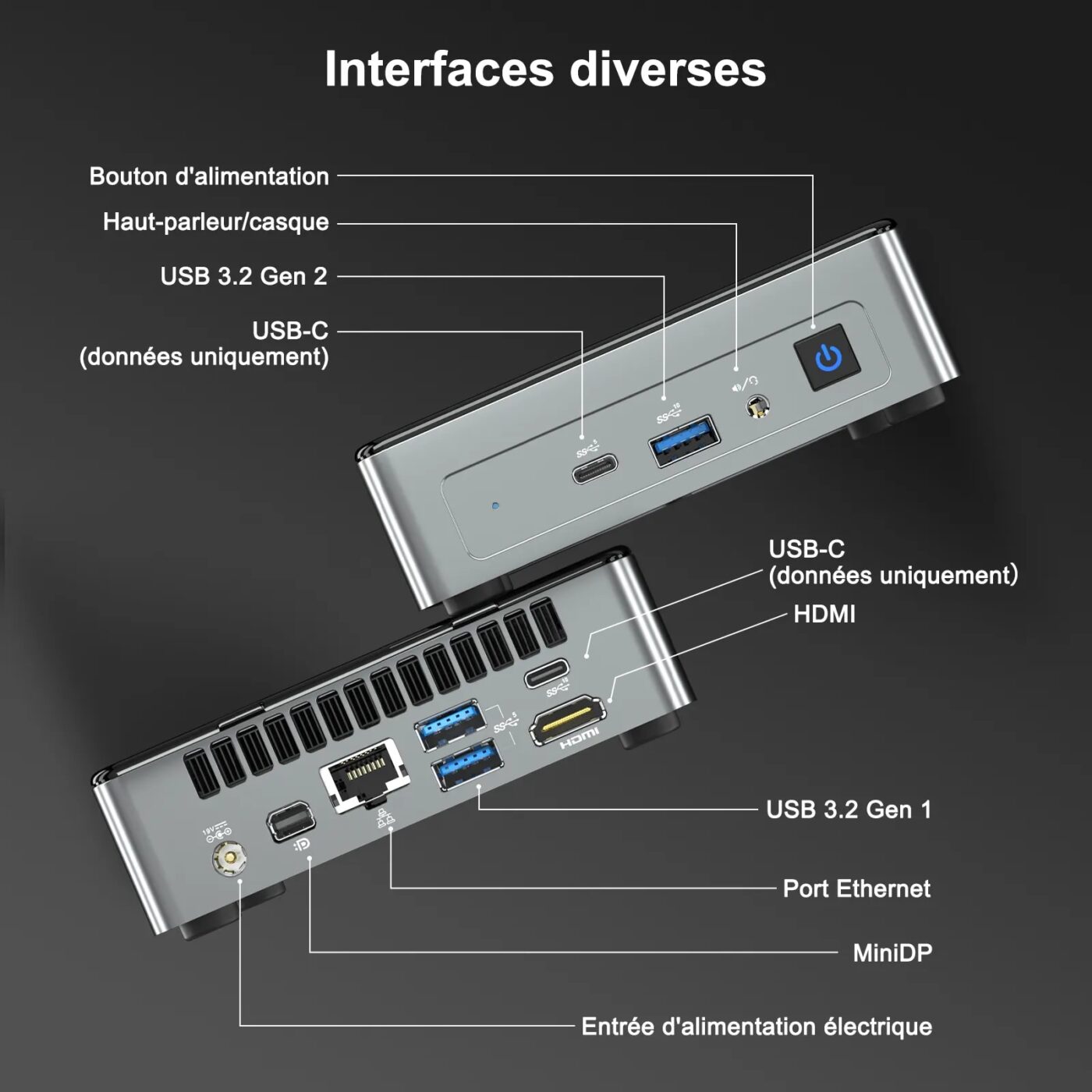 Le tout dans un boîtier ultra-compact (117 × 112 × 49,2 mm, ~652 g) qui permet de gagner de la place sans sacrifier les performances.