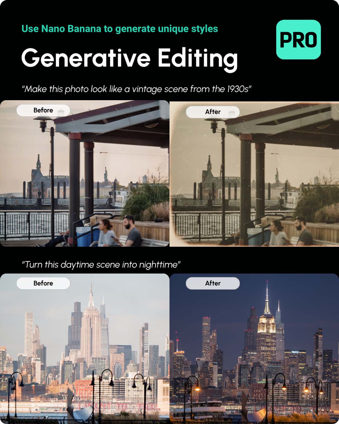 Enfin, et c’est sûrement le point le plus inédit de cet “appareil photo” : on retrouve directement dans l’appareil une fonction Generative Editing, qui permet d’utiliser le modèle Google Nano Banana pour complètement modifier par IA une photo à la demande.