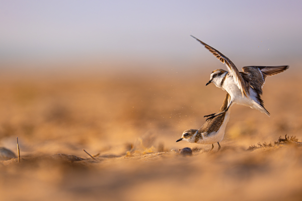 « Cet accouplement de gravelots à collier interrompu a été saisi dans la lumière dorée d’un soir. » Un instant intime, témoin d’un comportement rare sur les plages atlantiques. La composition met en valeur la délicatesse d’un moment de vie discret.