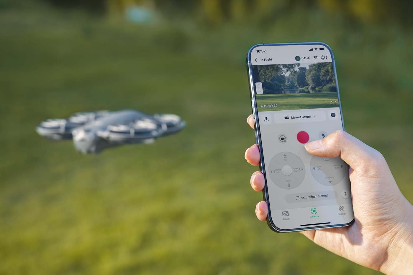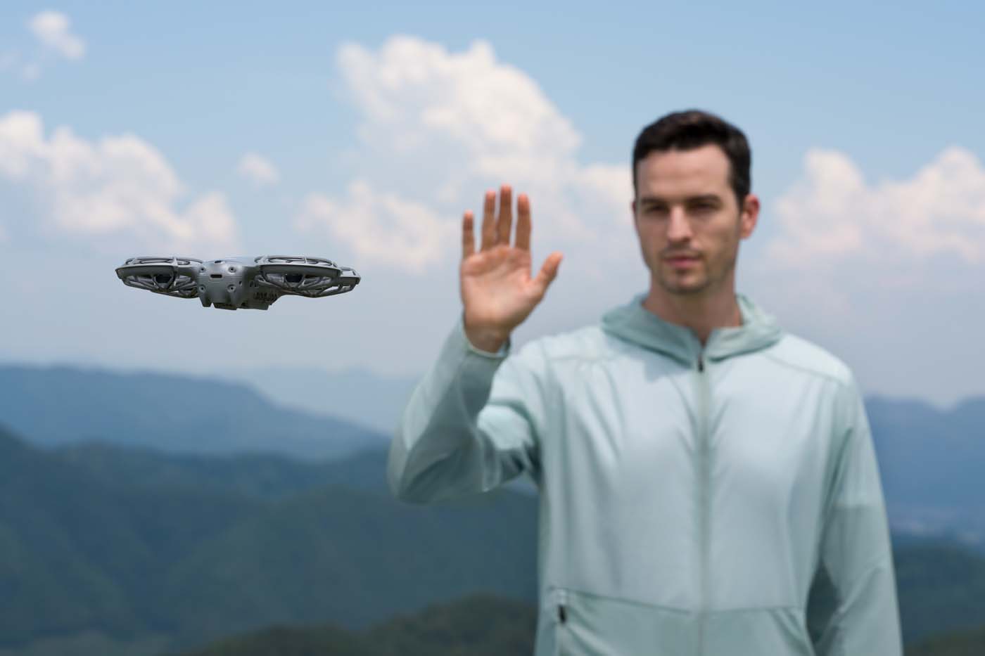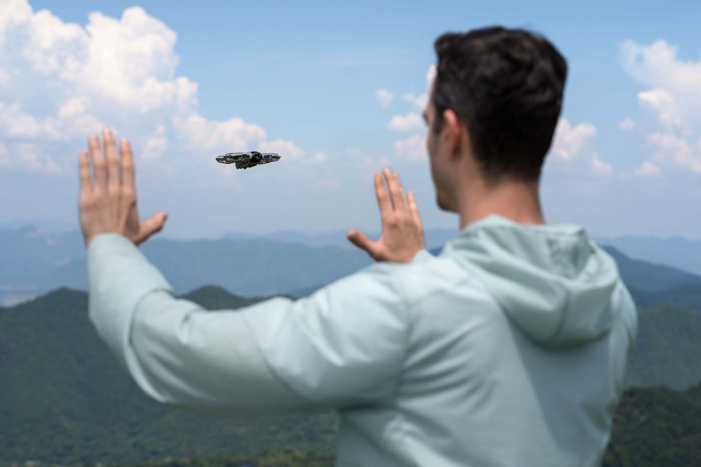 Le drone peut décoller depuis la paume de la main, se placer automatiquement devant l’utilisateur, et être contrôlé grâce à un pilotage gestuel avancé. Lever la main, avancer le bras, changer de côté… le drone interprète les mouvements de manière plus naturelle et plus fiable. Il est également possible de commander le smartphone à la voix via son smartphone, pour par exemple lancer l’enregistrement.