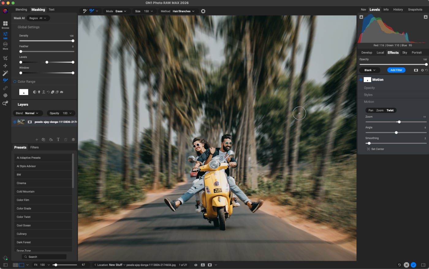 L’effet de flou filé est un excellent moyen d’ajouter du dynamisme à vos photos… mais il peut être difficile à maîtriser. Aussi, ON1 Photo RAW 2026 permet d’ajouter un effet de flou a posteriori sur n’importe quelle image. D’après l’éditeur, différentes options sont disponibles, vous permettant “d’appliquer un mouvement de panoramique, de zoom ou de rotation après la prise de vue”. À la clé, des clichés plus originaux et visuellement plus attrayants.