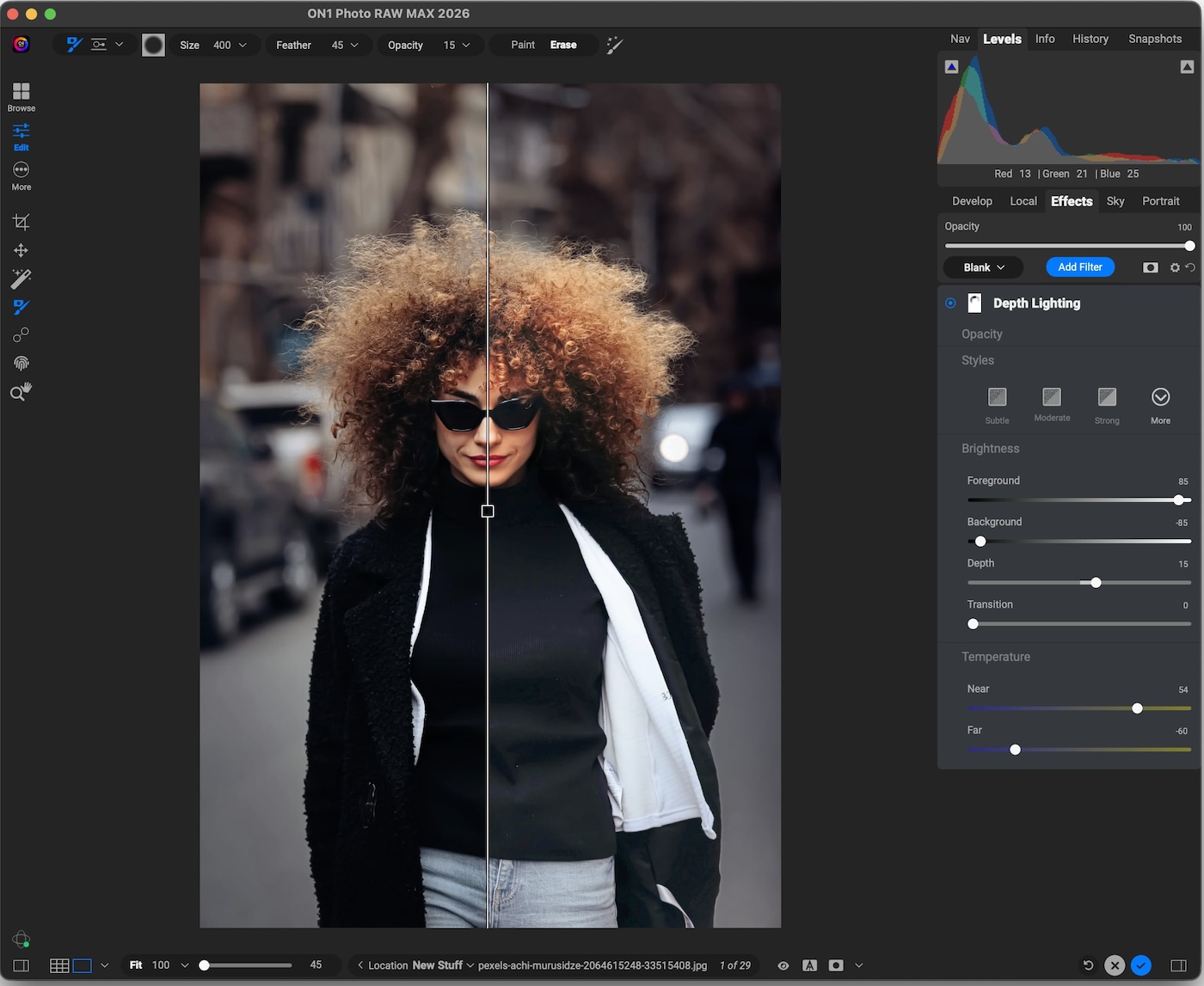 ON1 Photo RAW 2026 profite également d’un nouveau mode, nommé Depth Lighting. Son but : jouer sur l’éclairage du sujet – ou de l’arrière-plan. Disponible dans le panneau “Effects”, il se base sur l’IA pour calculer intelligemment l’éclairage à appliquer, afin de mieux valoriser le sujet. Différents curseurs permettent de doser l’intensité de l’effet ainsi que la transition entre l’avant-plan et l’arrière-plan.