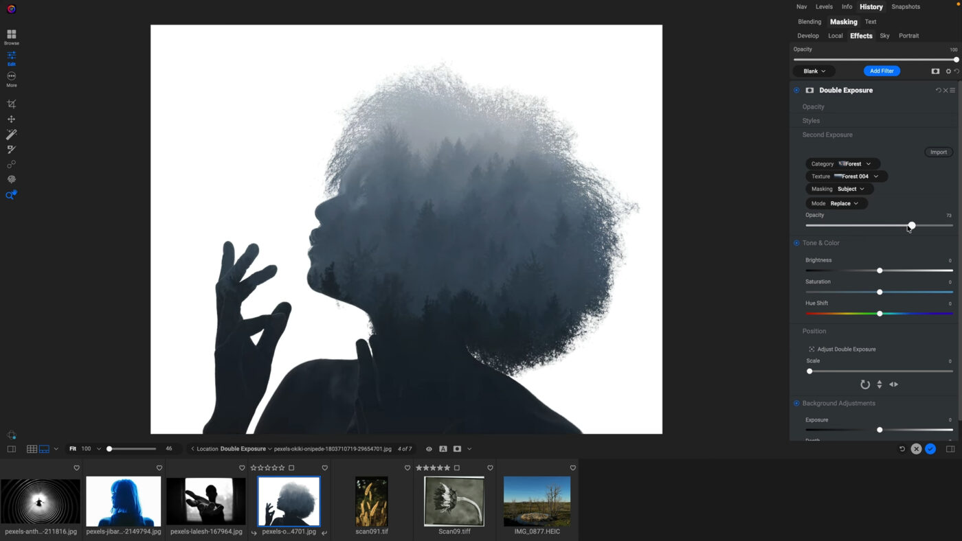 L’effet de double exposition (ou surimpression) est particulièrement tendance. Pour vous permettre de l’obtenir plus facilement, ON1 Photo RAW 2026 profite désormais d’un mode dédié à cette pratique photo. Plusieurs options doivent offrir un certain contrôle sur la manière dont les images sont combinées (claires, sombres, subtiles, audacieuses). Un bouton “aléatoire” permet également d’obtenir des résultats très surprenants.