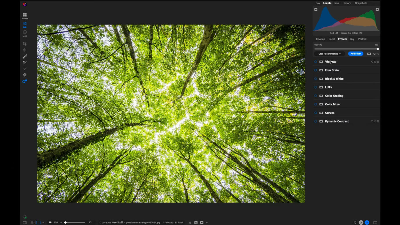 ON1 Photo RAW 2026 ajoute une nouvelle option “Starting Points”. Le principe : en sélectionnant l’option « ON1 Recommends », le logiciel analyse l’image et vous propose, en un clic, une base “saine” pour une photo finale que vous pouvez exporter sur votre disque – ou continuer à retoucher. Au sein du menu filtres, vous pouvez toujours retrouver vos filtres préférés, créer vos propres presets ou de marier différents effets.