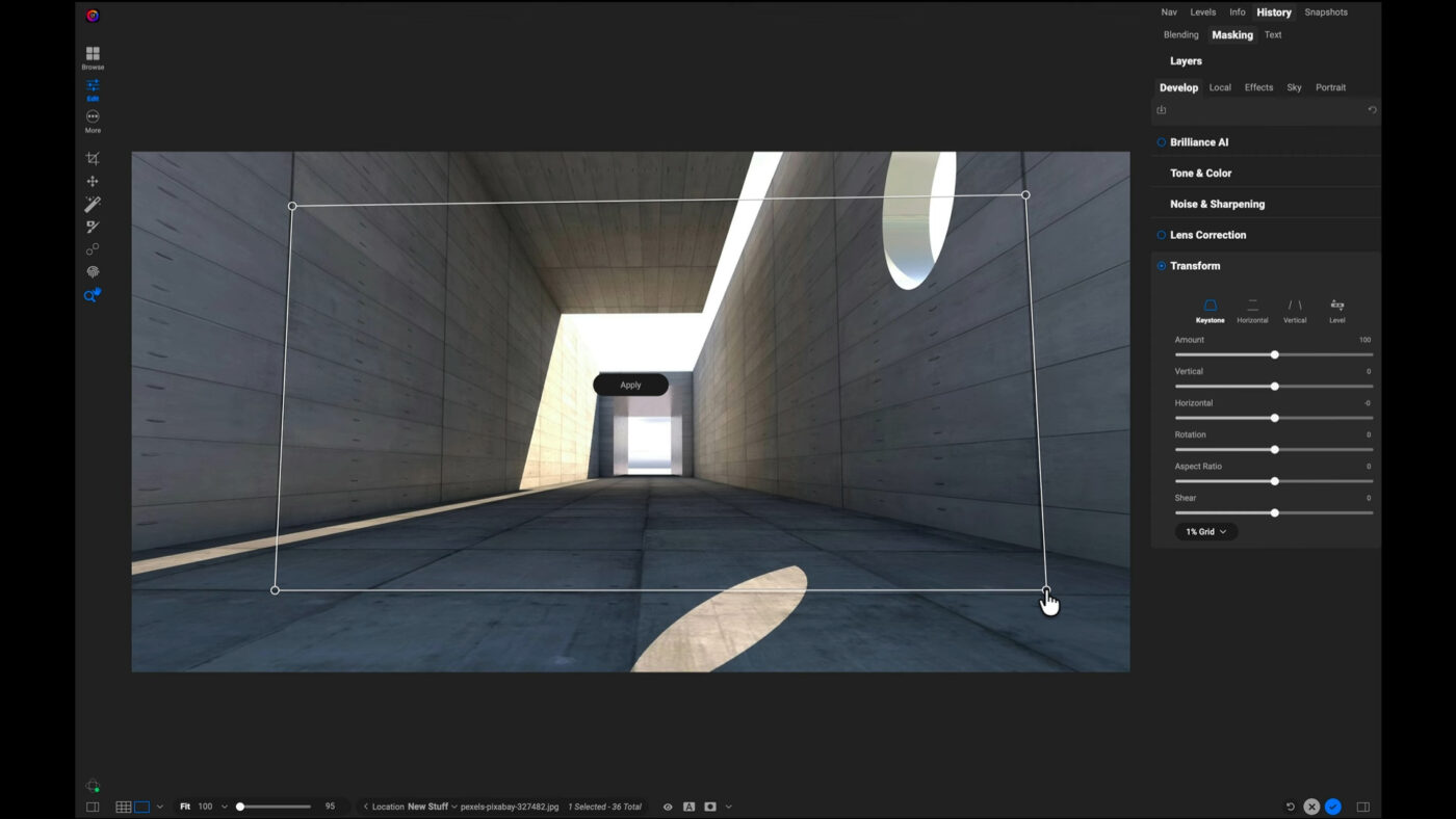 Le module “Transform” permettait déjà de corriger (manuellement) l’inclination horizontale ou verticale d’une photo (entre autres options). Avec la version 2026, ON1 Photo RAW dispose d’un nouveau mode automatisé. À l’instar de celui proposé dans Lightroom ou Camera RAW, il suffit de tracer des lignes verticales ou horizontales, et le logiciel redresse lui-même les perspectives.