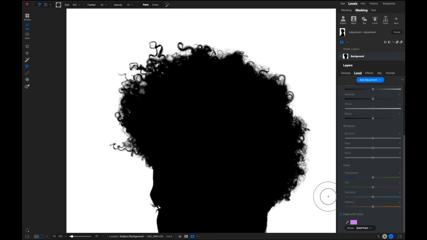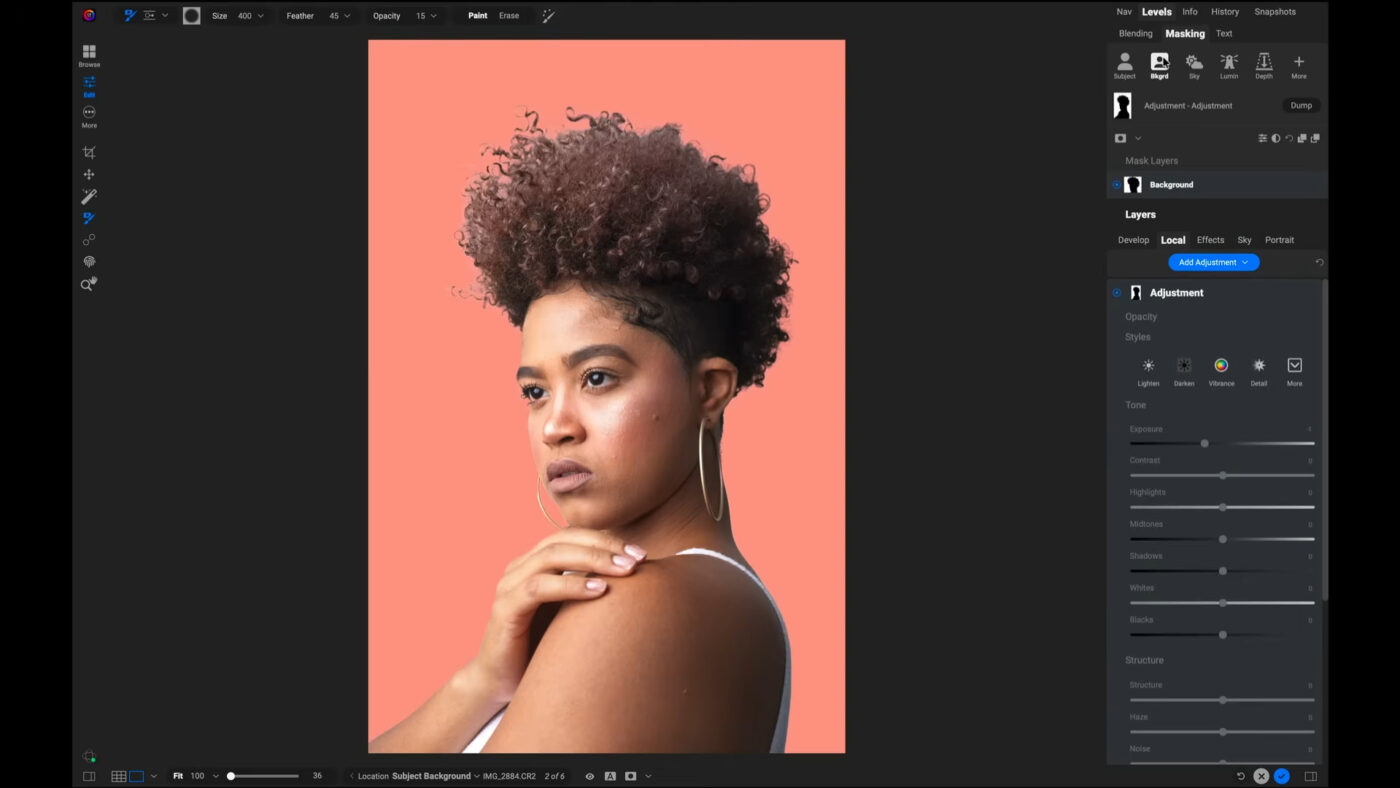 Le principe est plutôt simple : en cliquant sur un sujet, l’IA détecte automatiquement ses limites et crée un masque de retouche. Vous pouvez appliquer vos corrections sur le sujet (ou sur l’arrière-plan) – voire combiner plusieurs masques entre eux. Ce mode devrait être très utile pour les motifs “complexes” : cheveux, poils et plumes d’animaux, etc.