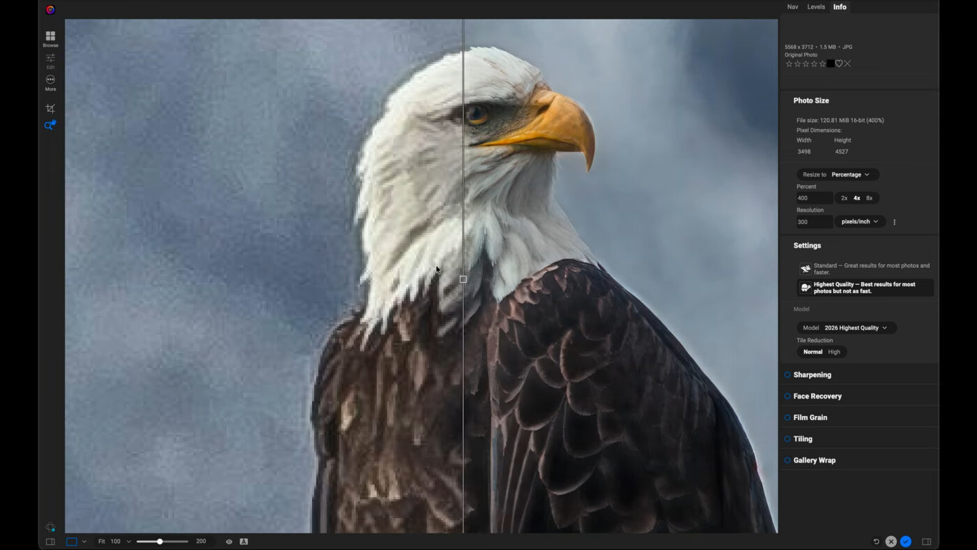 - Highest Quality : basé sur un processus de “diffusion”, il doit permettre de recréer les détails manquants, d’accroître la netteté et de réduit le bruit numérique des photos, y compris à partir de fichier de très petite taille ;