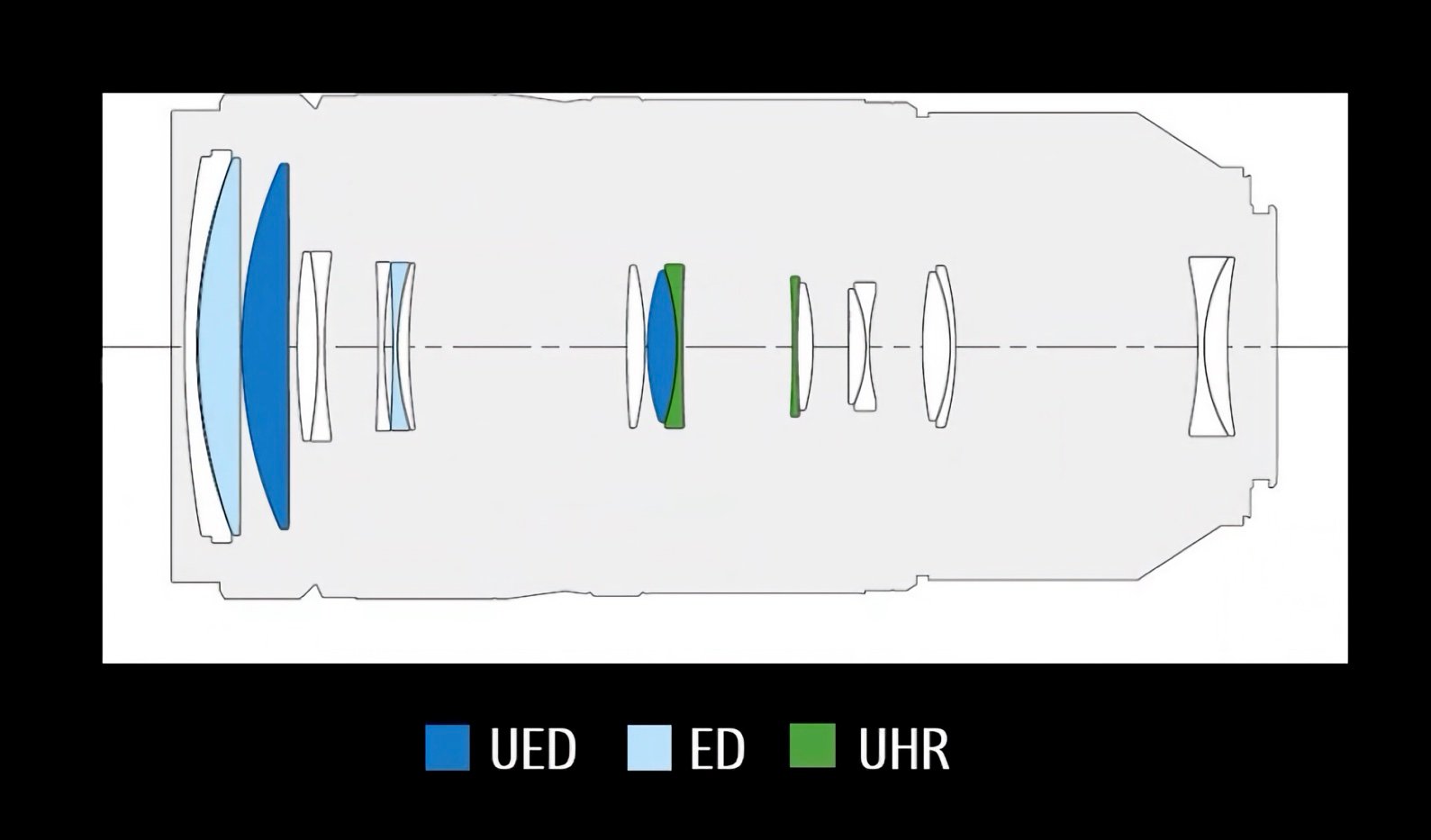 - construction optique : 19 éléments répartis en 12 groupes (2 lentilles UED, 2 lentilles LD, 2 lentilles UHR)