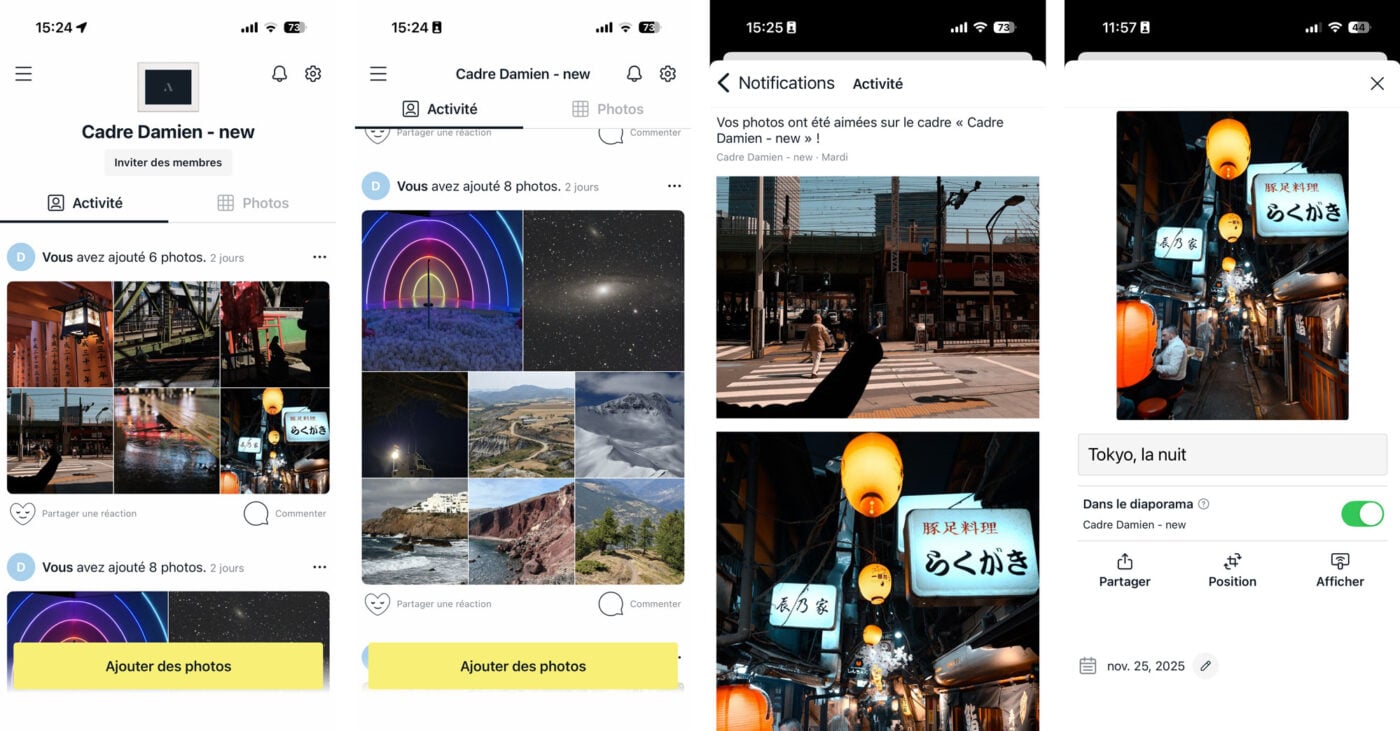 Chaque personne peut envoyer des photos au cadre, et celles-ci apparaissent très rapidement. D’ailleurs, si vous disposez déjà de cadres de chez Aura Frames, vous pouvez transférer des photos d’un cadre à un autre, ou envoyer la même photo sur plusieurs cadres simultanément. Ce côté “geek” mobile est très apprécié.
