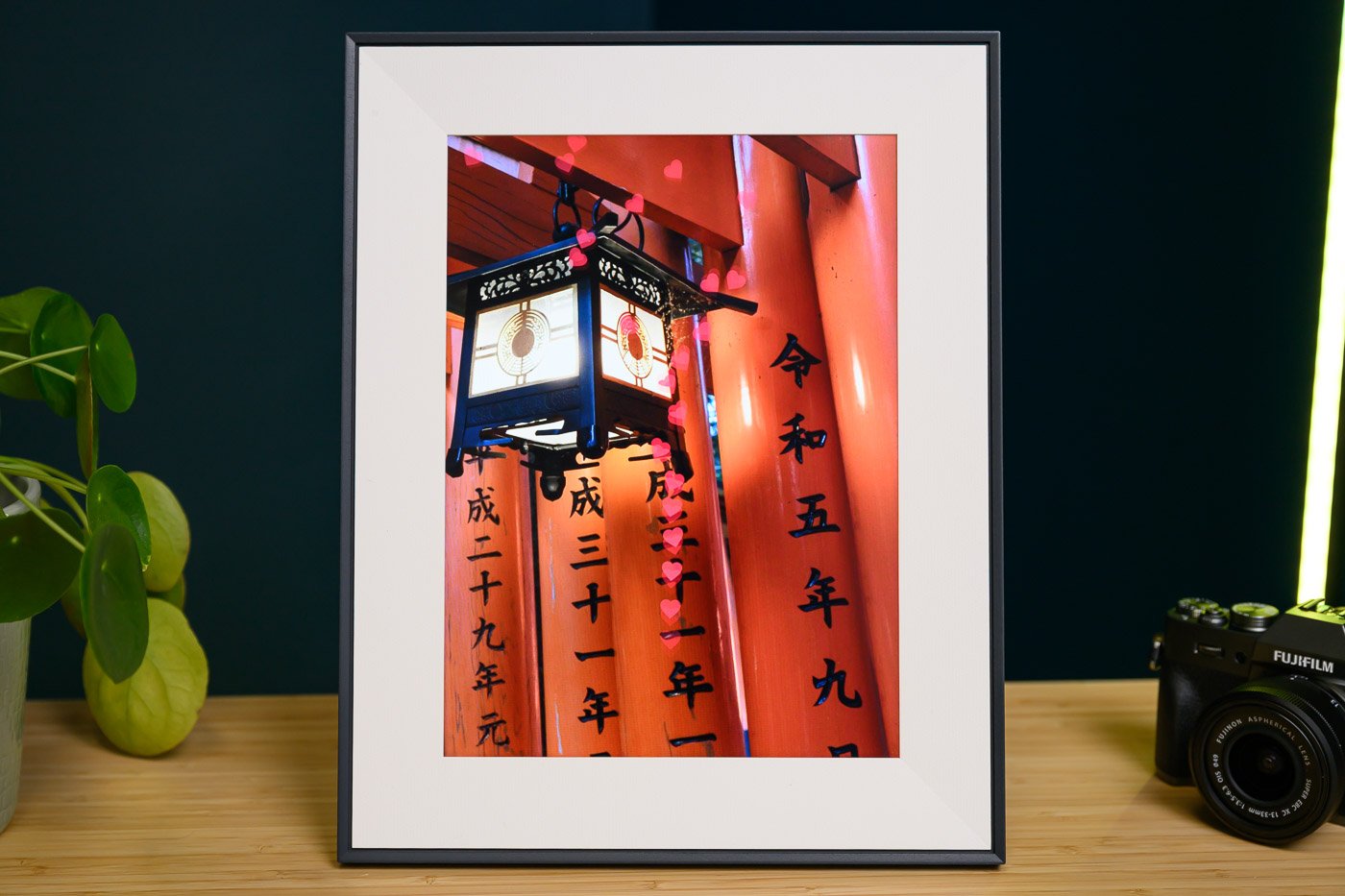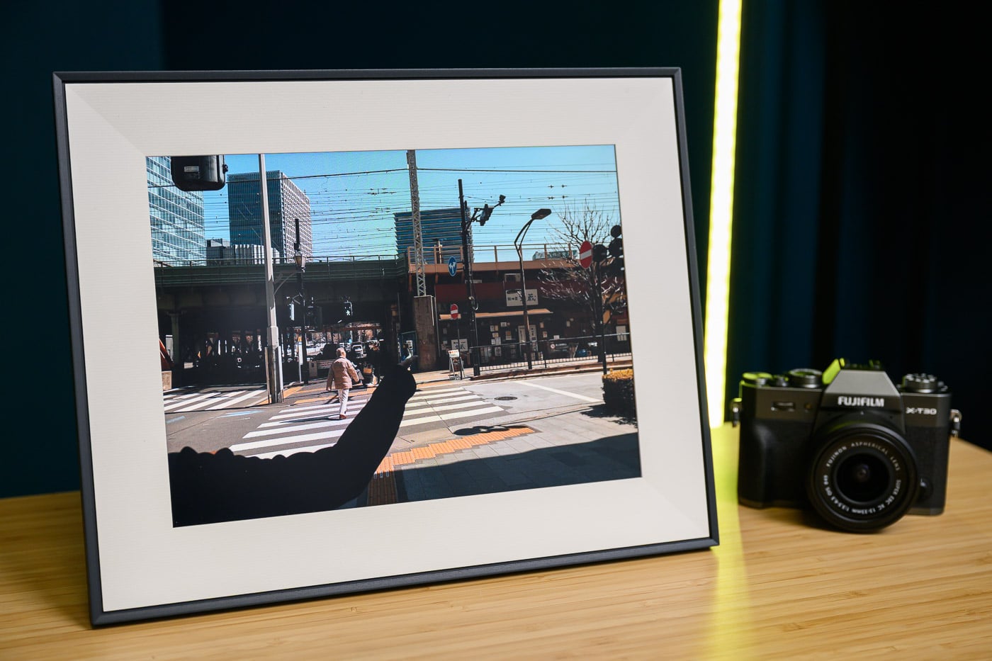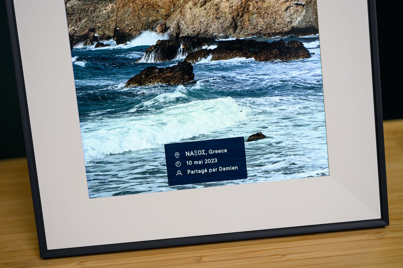 L’écran n’est toujours pas tactile, un parti pris assumé pour préserver l’illusion d’un tirage derrière un passe-partout et éviter les traces de doigts. Sur le cadre, deux barres tactiles présentes sur les tranches permettent d’interagir avec les photos : un glissement pour changer d’image, un tap pour afficher les infos (lieu, date, etc.), un double tap pour « liker » et envoyer une petite notification à la personne qui a partagé la photo.