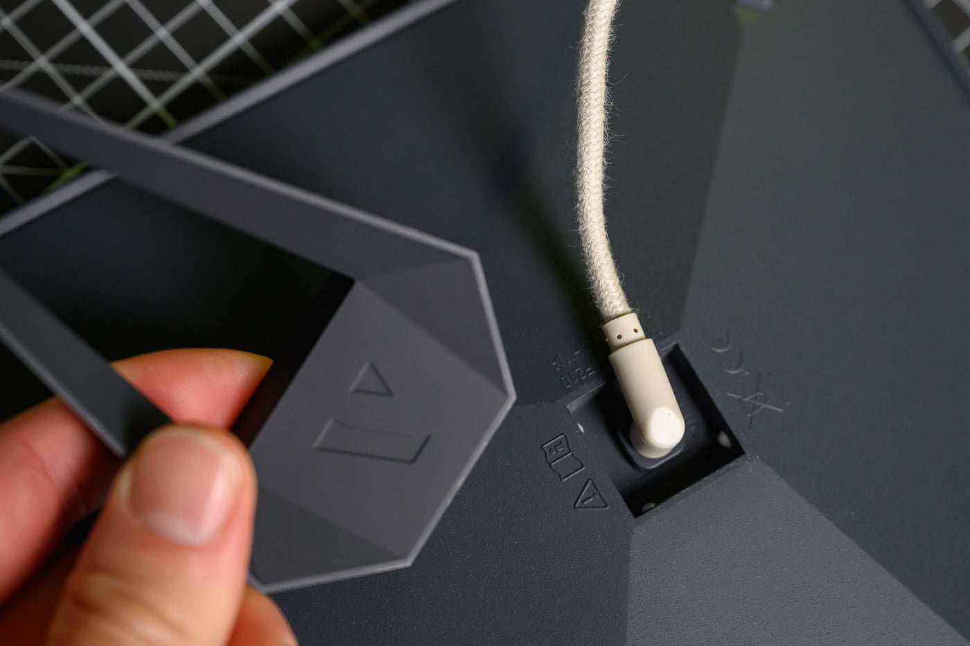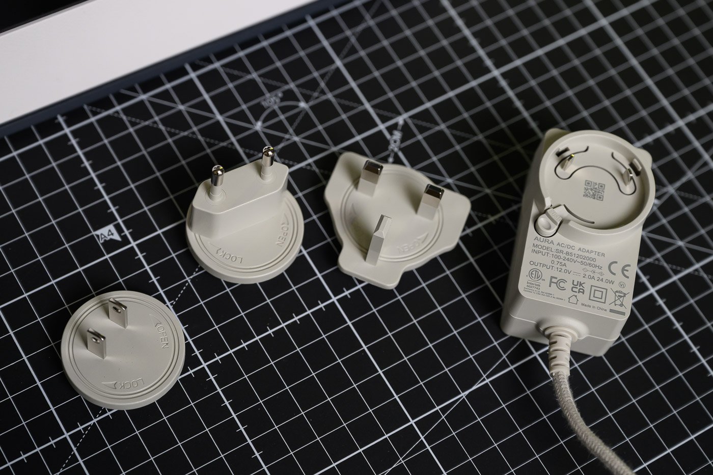 Le cadre est fourni avec un câble en tissu d’environ 2 mètres, d’une couleur grise. En plus de l’embout type E pour la France, Aura propose dans la boîte des embouts compatibles avec d’autres prises (États-Unis, Royaume-Uni). Une façon de n’avoir qu’un SKU pour l’ensemble des pays.