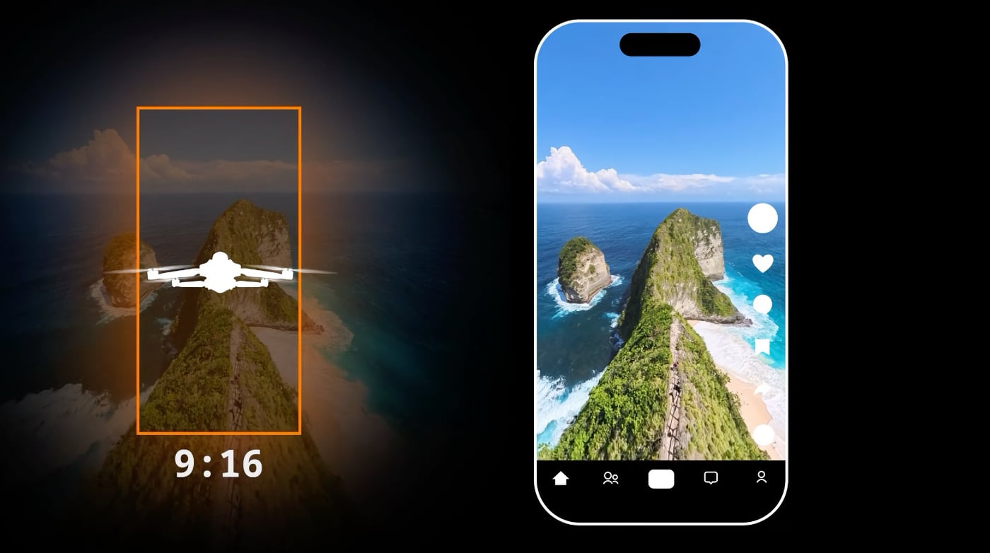 Les images, capturées à 360°, sont à éditer avec l’application Antigravity. Elle permet de sélectionner facilement la portion de l’image à conserver et de les exporter dans le ratio de son choix (16:9 horizontale, 9:16 vertical, cinéma 2,35:1, etc.). De plus, on peut aussi d’obtenir plusieurs vues (frontale, latérale, aérienne) d’une même séquence en post-production.