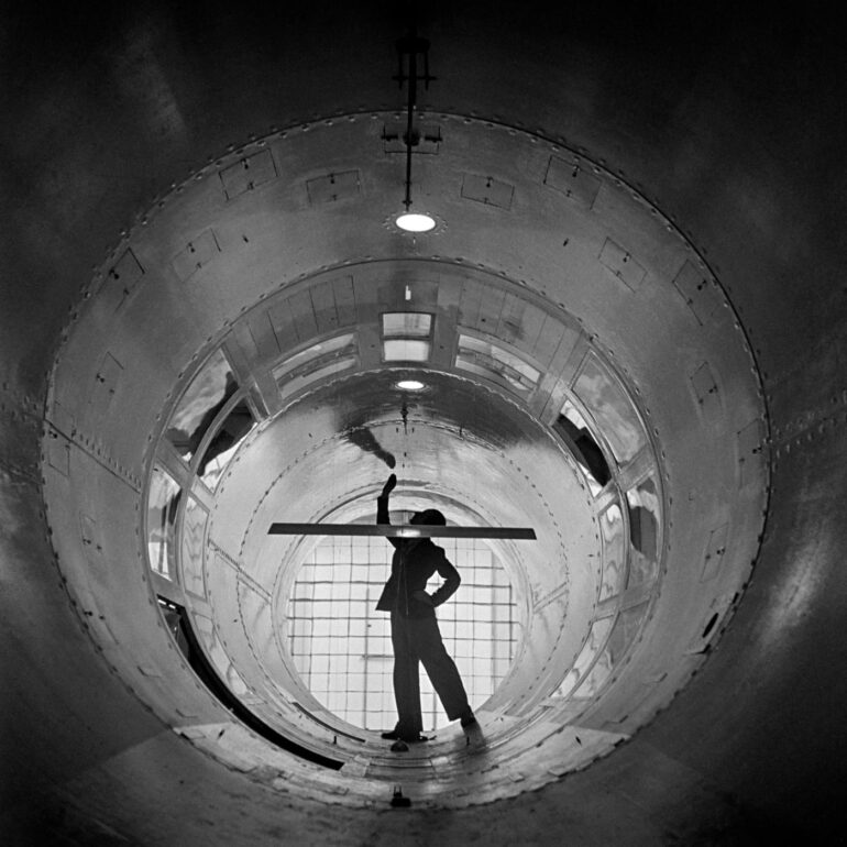 L’exposition présentée à la galerie Roger-Viollet rappelle l’immense diversité de ses sujets. Gaston Paris passe avec aisance des reportages industriels (il couvre les traversées du paquebot Normandie, immortalise les souffleries aéronautiques de Meudon, côtoie les ateliers ferroviaires) mais se glisse aussi dans les coulisses des hauts lieux de la culture (de l’Opéra Garnier aux chantiers parisiens). Des paysages urbains qui l’entoure, il extrait des compositions frôlant l’abstraction.