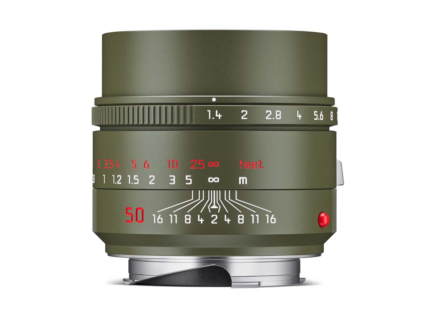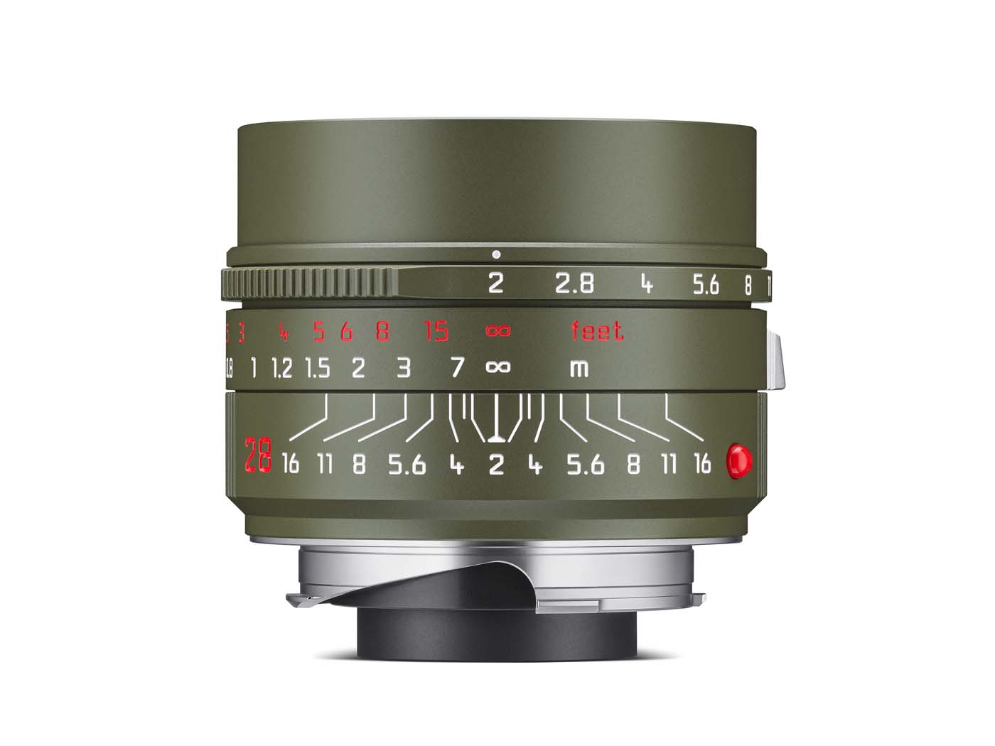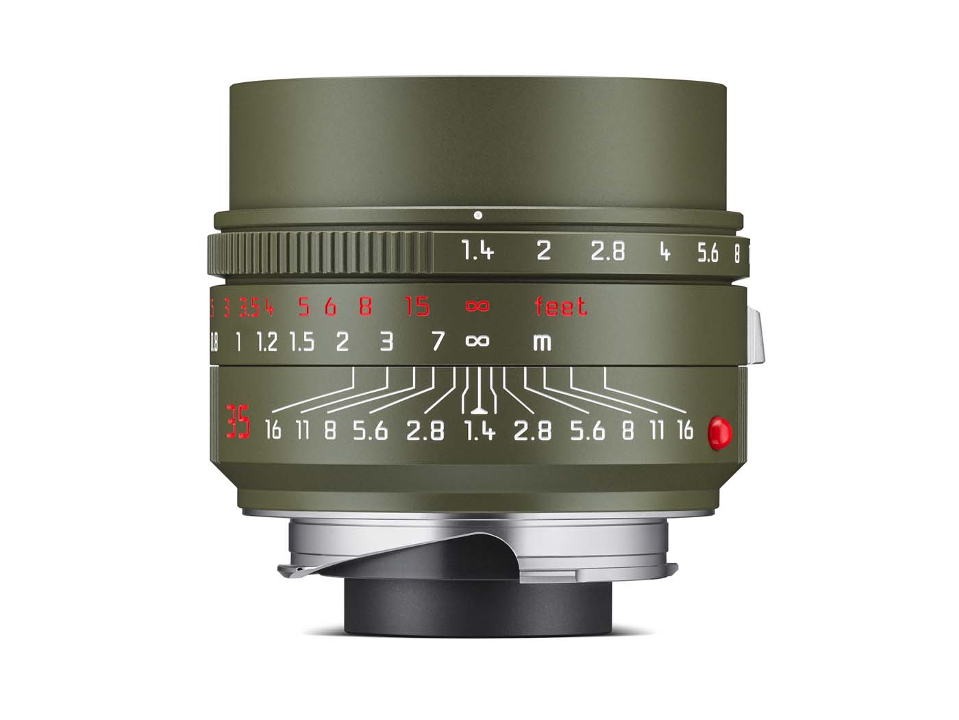 Les trois optiques partagent la même esthétique, avec un fût vert olive mat, à la peinture annoncée comme particulièrement résistante. L’ergot de mise au point est en laiton chromé argent, tandis que l’échelle de mise au point est rouge en pieds, et blanc en mètres, ainsi qu’un pare-soleil escamotable sur les Summilux 35 et 50 mm.