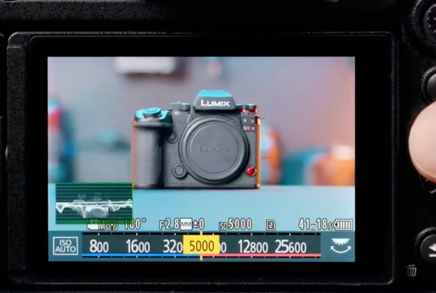 Concrètement, lorsque l’on change ses ISO en vidéo, une règle de couleur bleu et rouge apparaît sous les ISO. La première valeur bleue correspond à l’ISO natif 1, quand la première valeur rouge équivaut à l’ISO natif 2. Ces valeurs changent selon le profil utilisé (Log, RAW, etc.), par exemple : 640 et 5000 ISO en Log avec le Lumix S1 II, et le boîtier adapte automatiquement son échelle de couleur.