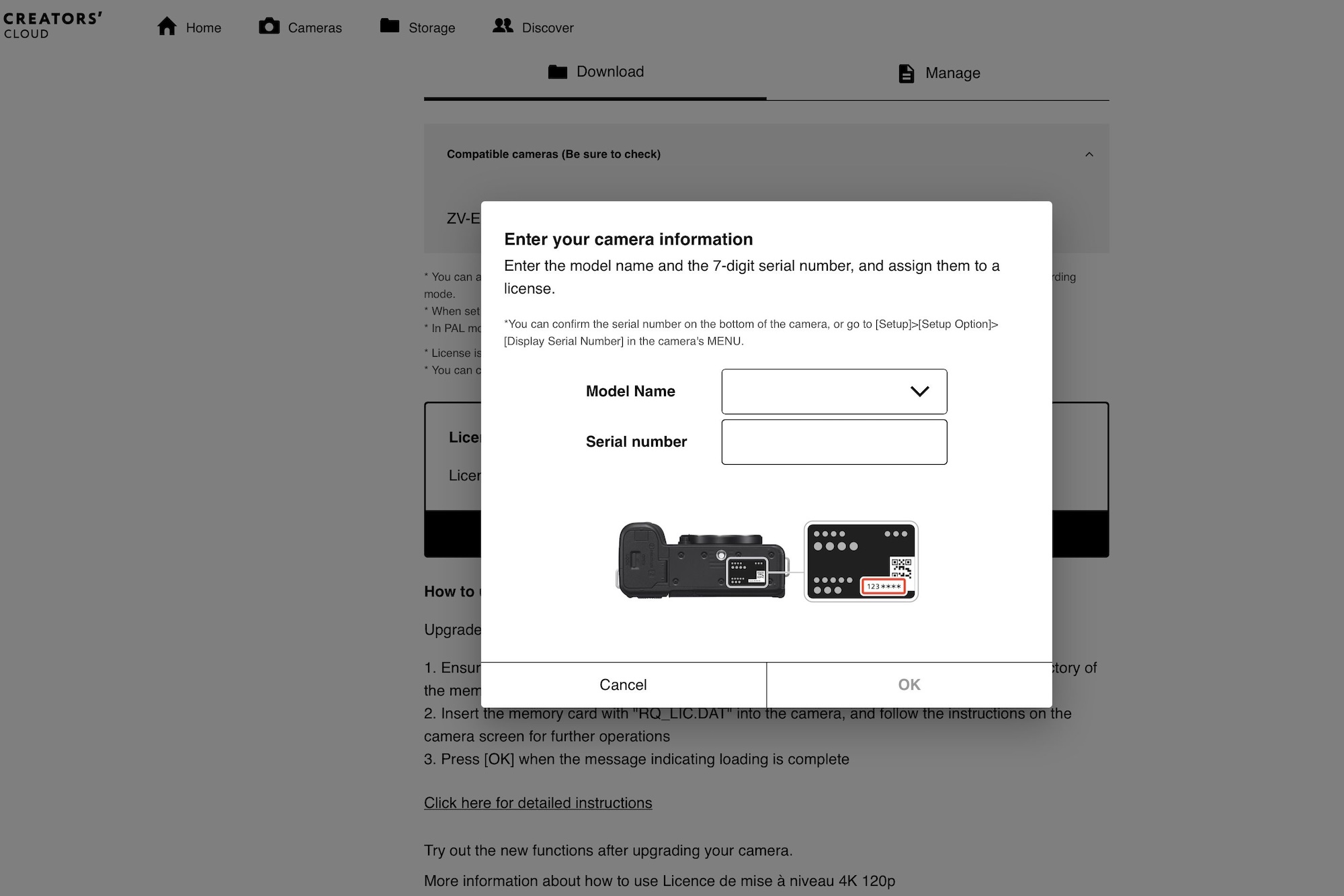 De façon assez surprenante, il ne faut pas passer par la plateforme de téléchargements de firmwares classique de Sony, mais via le site Sony Creators’ Cloud. Il faut ensuite s’inscrire sur la plateforme indiquer le modèle de boîtier et son numéro de série, puis récupérer, non pas une mise à jour, mais une « licence de mise à niveau » 4k 120p. Cette licence est gratuite et perpétuelle.