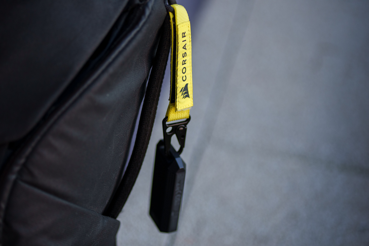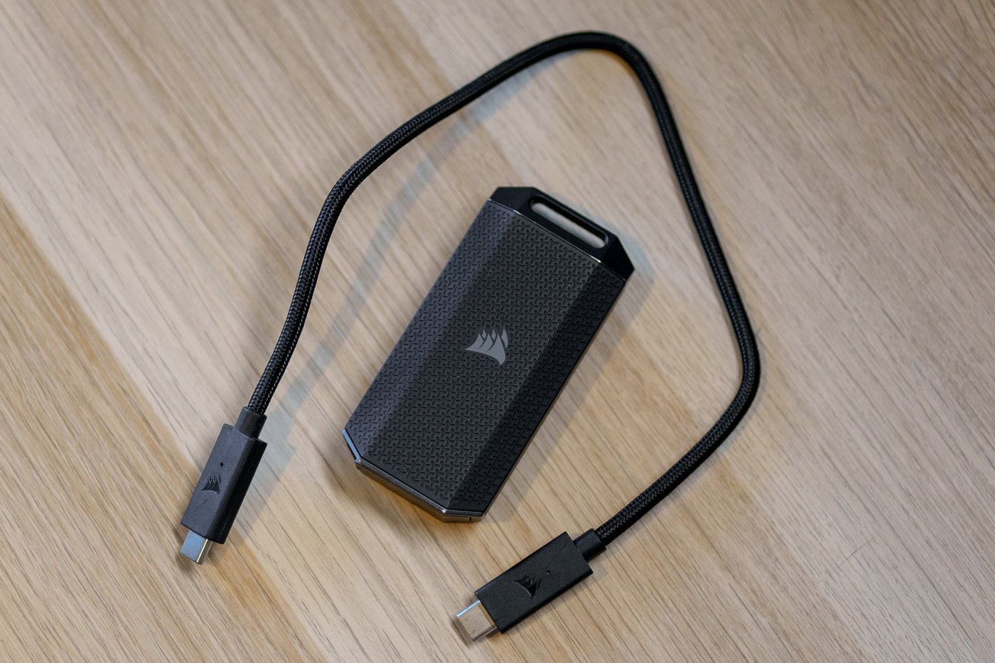Corsair fournit un câble USB-C vers USB-C d’environ 30 cm, compatible USB4 / Thunderbolt 4, et recouvert d’une gaine tressée. Un point d’accroche permet de sécuriser le SSD lors du transport grâce à une sangle livrée dans la boîte.