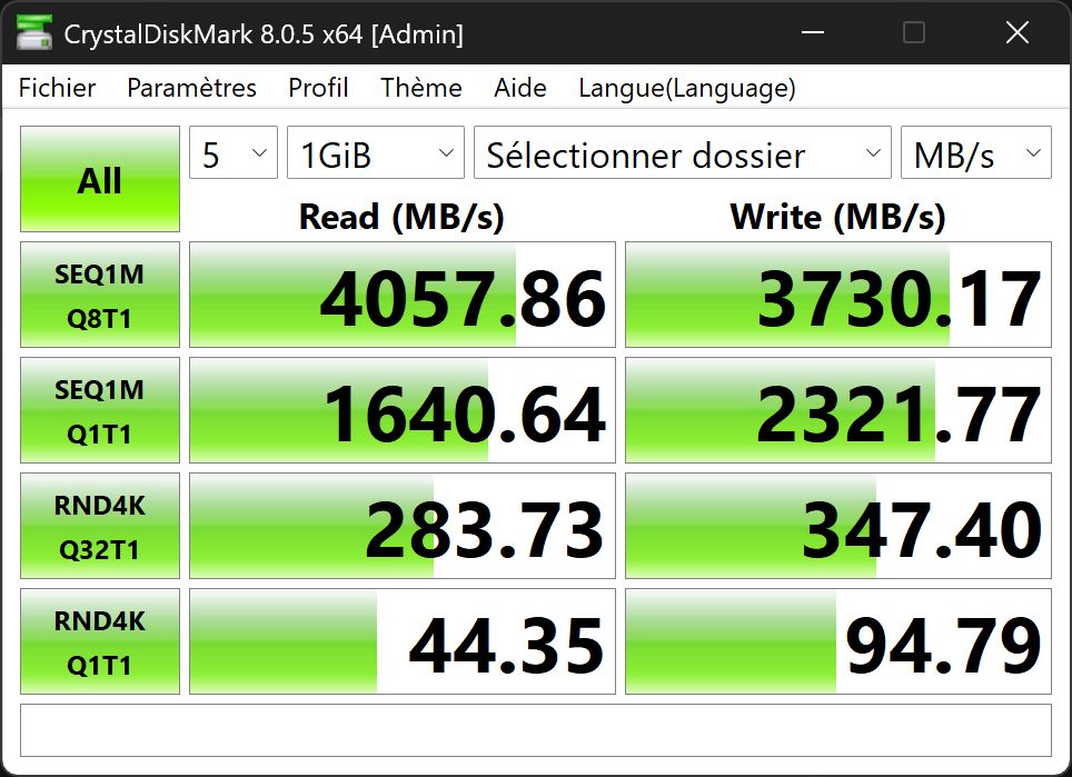 Avec 4057 Mo/s en lecture et 3730 Mo/s en écriture, ce SSD se hisse parmi les plus performants que nous ayons pu mesurer.