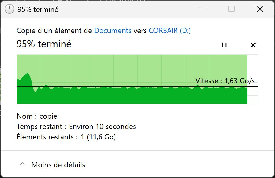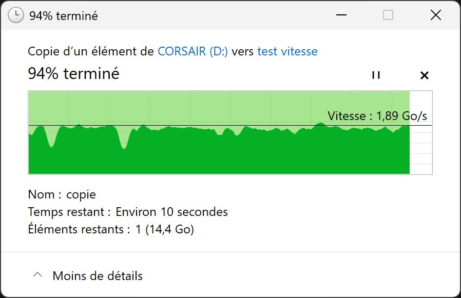 Plus étonnant : la copie vers le disque du PC – hormis quelques décrochages – s’est effectuée très rapidement, avec des vitesses flirtant avec les 1,90 Go/s.