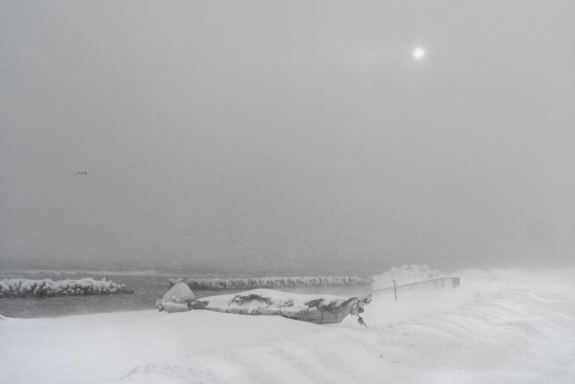 Les images exposées révèlent un univers où le blanc règne en maître absolu. La neige recouvre tout – bâtiments industriels, bateaux abandonnés, congères monumentales – tandis que le ciel gris se confond avec l’horizon dans une même palette de gris argentés. Cette quasi-monochromie n’est pourtant jamais monotone : la photographe excelle à capter les subtiles variations de lumière et les textures de la neige.