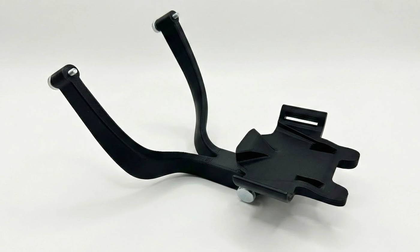 Tyler Staub s’est alors orienté vers un système de cage, qui permettait de ne pas déplier les ailes du drone. Son système, réalisé en impression 3D, consiste en un plateau avec sangle pour maintenir le drone, tandis qu’un bras vient soutenir la radiocommande du drone pour le pilotage.