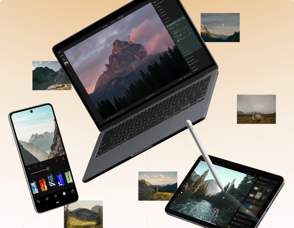 L’écosystème multi-appareils connecte smartphone, tablette et ordinateur pour un flux de travail unifié : commencez une retouche sur mobile, finissez-la sur desktop. Spaces permet de créer des galeries web personnalisées directement depuis le catalogue.