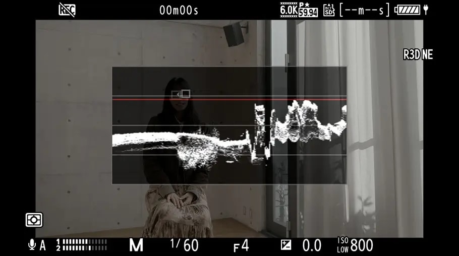 En mode R3D NE 12 bits, l’histoire et les waveform peuvent désormais afficher un avertissement spécifique pour le clipping sous forme de ligne rouge, facilitant la détection immédiate d’une perte de données dans les hautes lumières, un détail crucial quand on filme en RAW RED qui ne dispose pas du même niveau d’écretage.