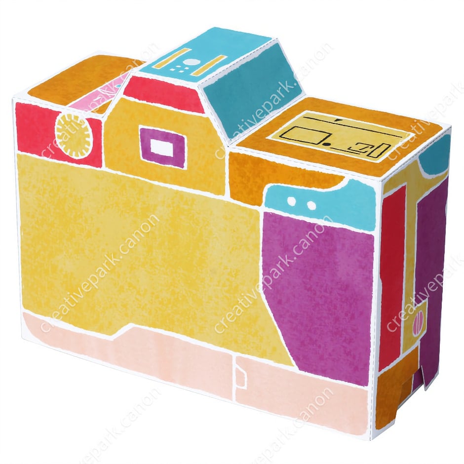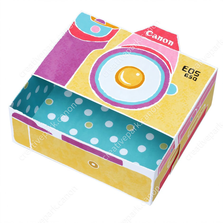 Premier reflex autofocus de Canon sorti en 1987, le mythique EOS 650 existe en version papercraft dans un style coloré et joyeux. Cette petite boîte décorative (110 x 85 x 42 mm) arbore des teintes vives qui tranchent avec le noir d’origine.