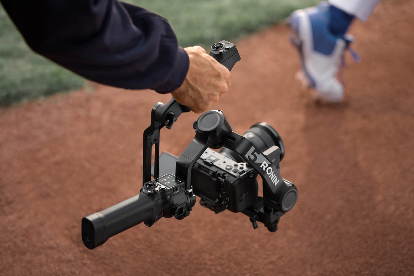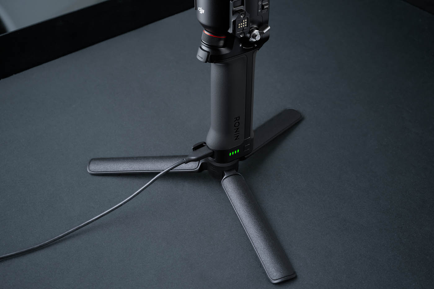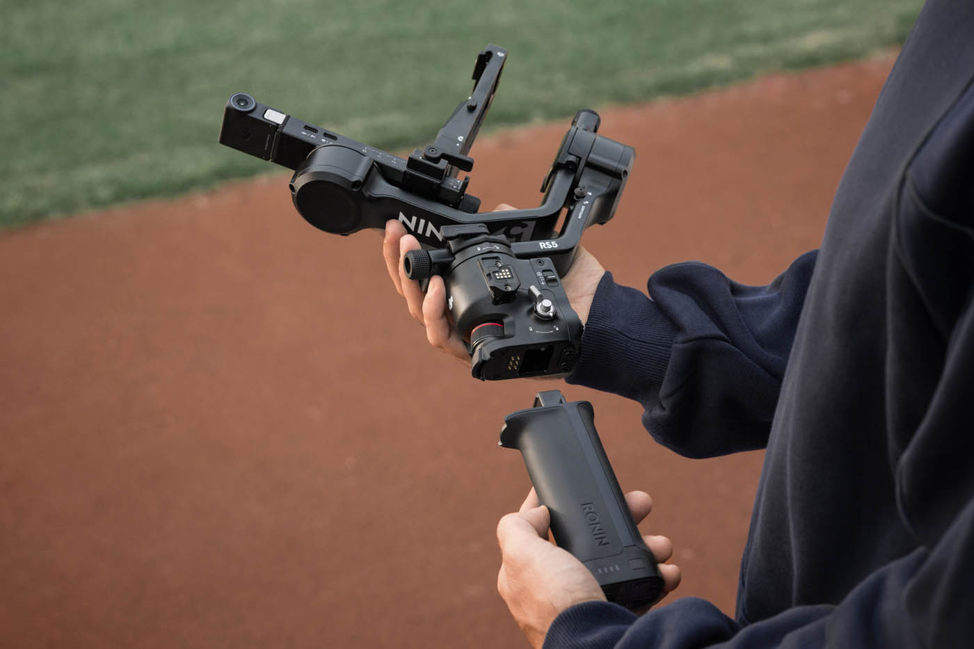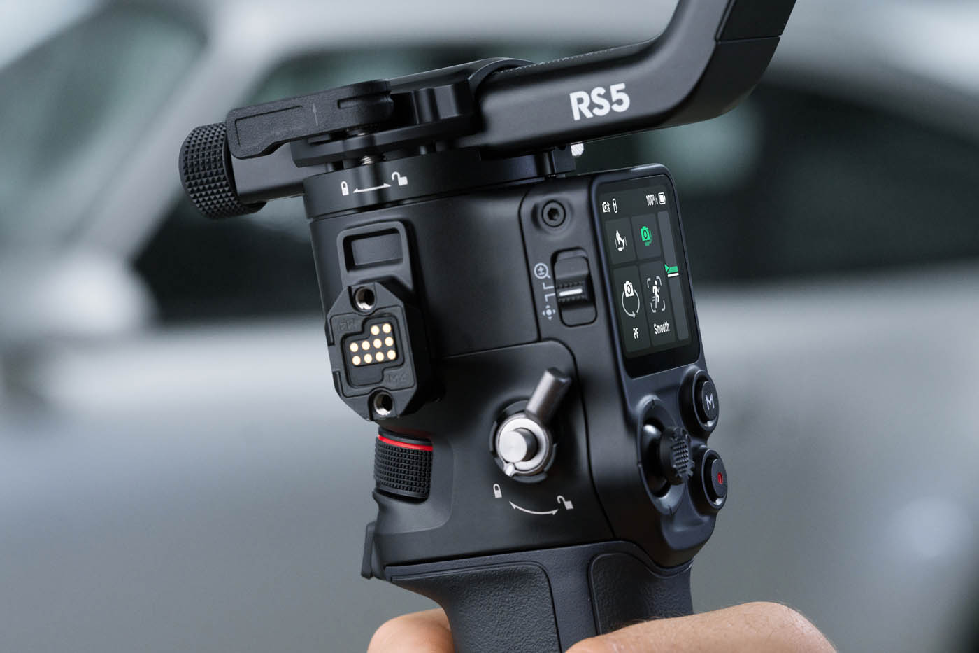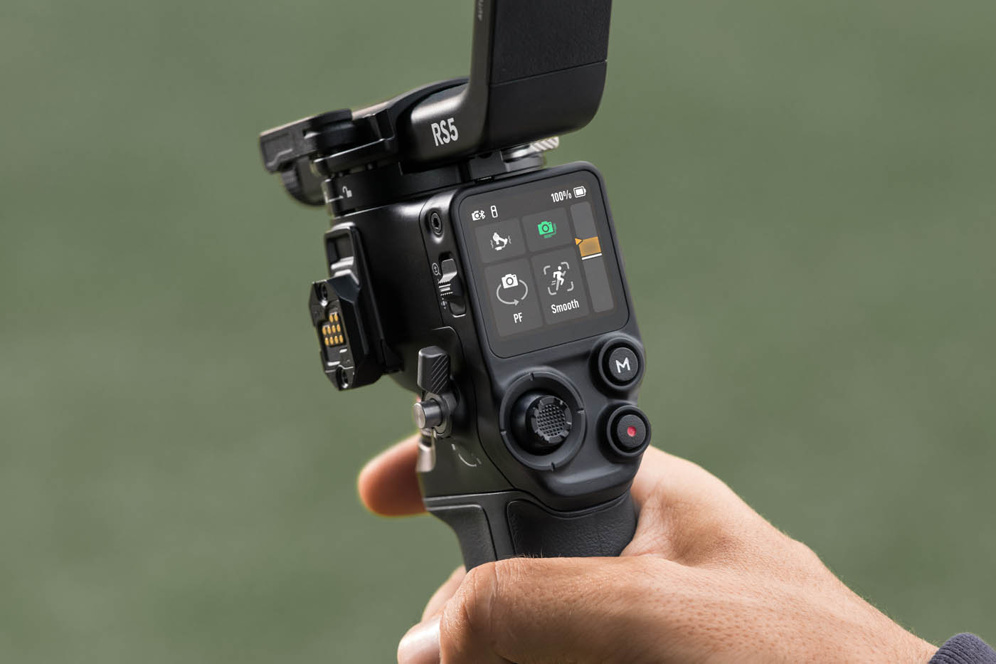 La poignée « mallette » électronique – quel nom bizarre –, déjà présente sur le RS 4, évolue avec un déport des commandes directement sur la poignée : joystick, boutons et gachette permettent désormais de contrôler la nacelle et l’appareil photo sans lâcher la prise. Un ajout très pratique pour les plans en plongée ou contre-plongée, où l’accès aux commandes principales de la nacelle devient acrobatique.