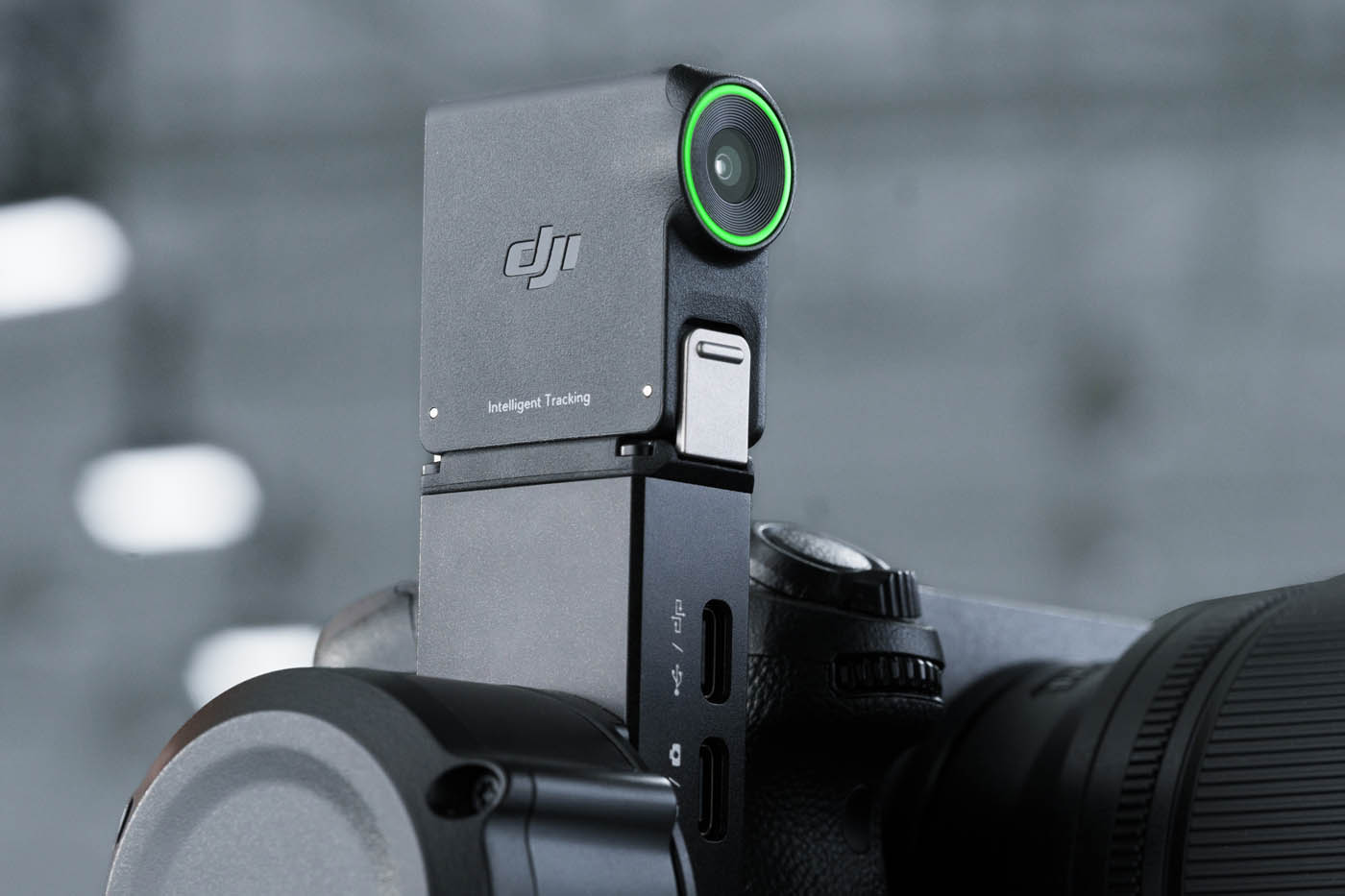Ici, DJI ne fait pas appel au LiDAR, mais bien à une caméra plus classique. Autour de l’objectif et à l’arrière du module, des LED rouges indiquent que le module est connecté. Celles-ci passent au vert lorsque le suivi est activé sur un sujet.