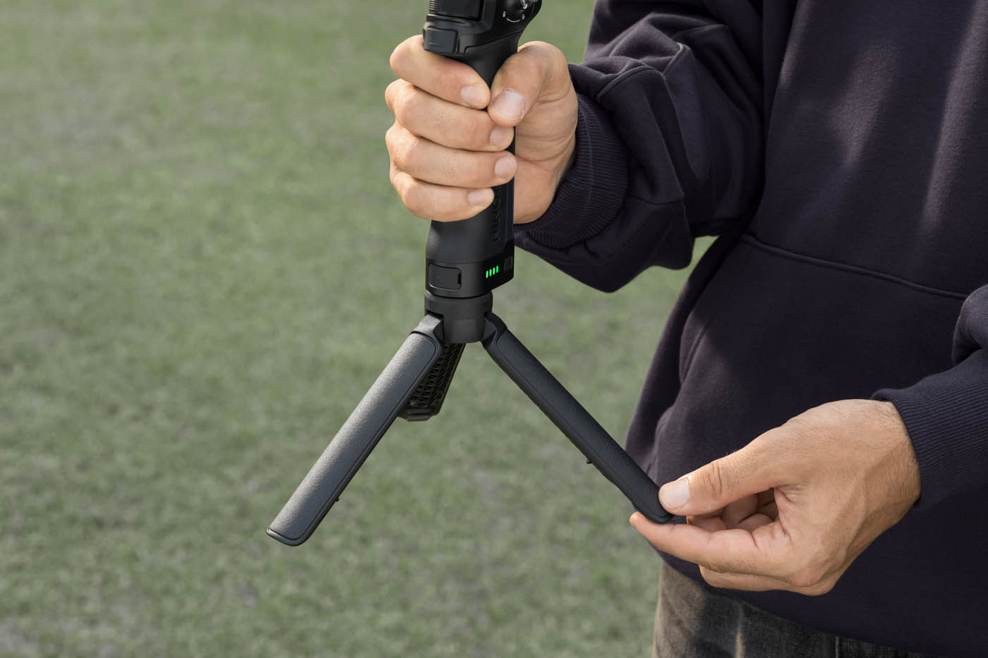 Enfin, le trépied, fourni avec le Bundle DJI RS 5, est toujours aussi pratique pour poser son setup au sol, ou servir de repos sur le corps lorsqu’on ajoute une sangle au gimbal.