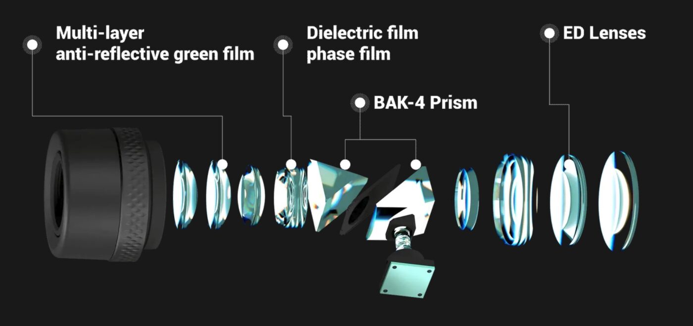 Les verres ED (Extra-low Dispersion) sont pensés pour limiter les aberrations chromatiques, tandis qu’un prisme BaK-4 assure une transmission lumineuse de 86 %, selon le fabricant.