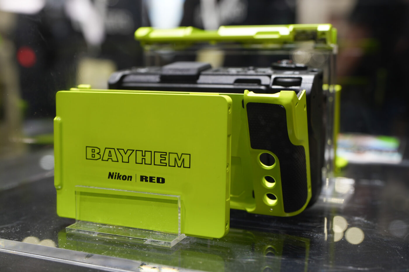 Sur le stand Nikon au CP+ 2026, dans l’espace dédié à la gamme Z Cinema, un boîtier attirait tous les regards : un Nikon ZR habillé d’une coque vert fluo frappée du nom « Bayhem » et du double logo « Nikon | RED ».