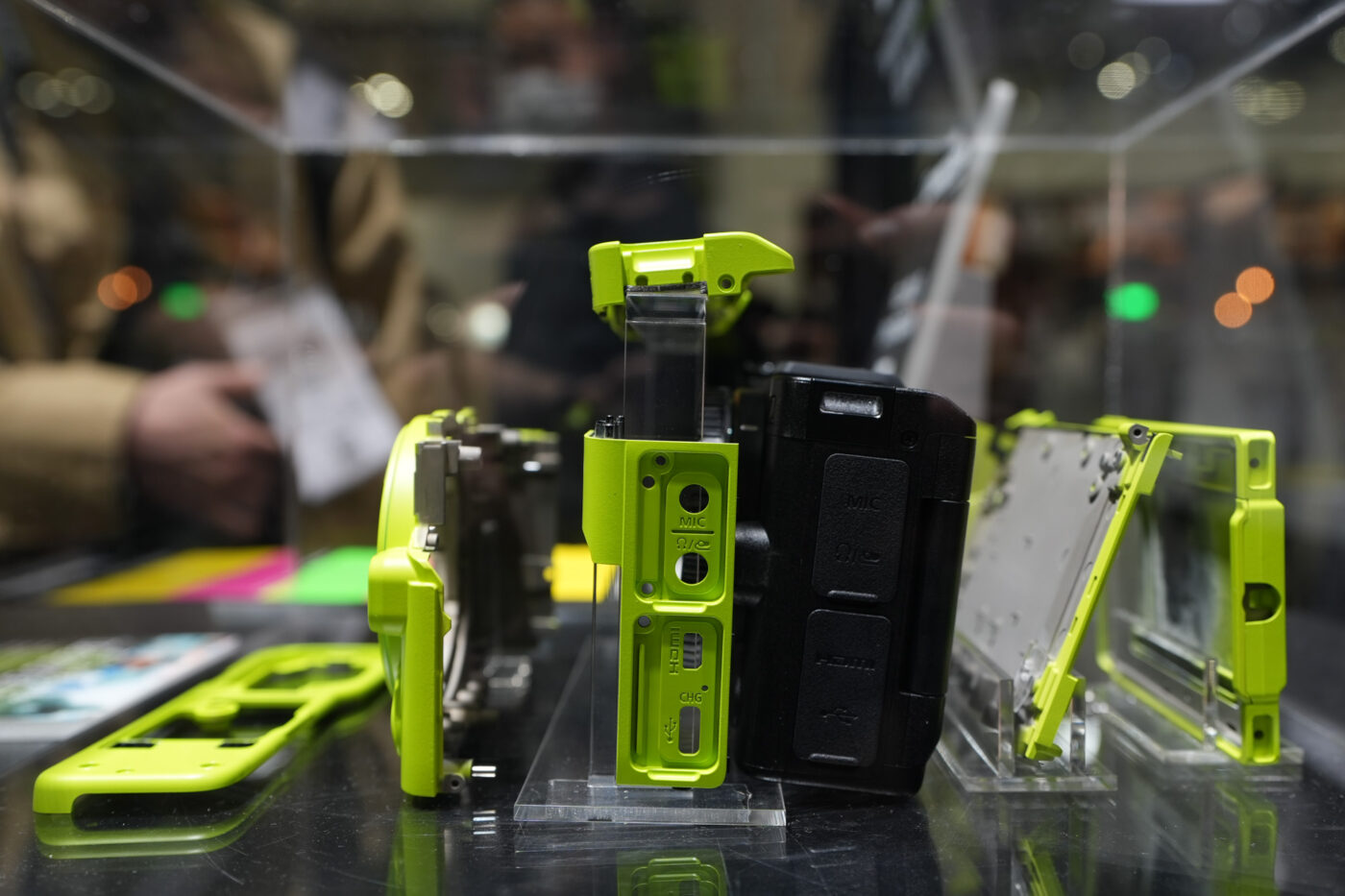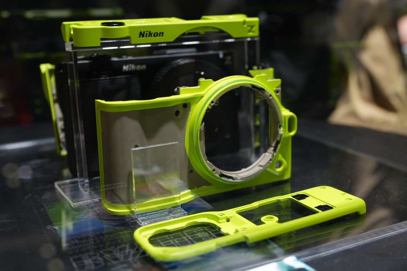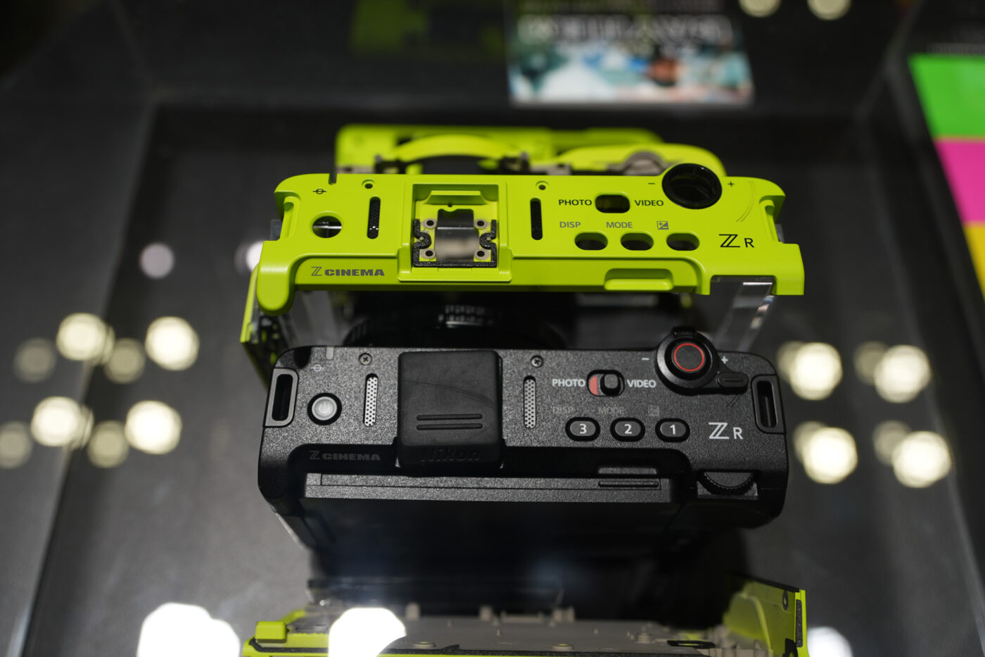 Présenté sous vitrine, le boîtier était exposé aux côtés de ses différentes pièces de coque détachées. Si l’on pourrait parler de « skin », il s’agit en réalité de bien plus que cela : la coque vert fluo ne vient pas simplement habiller la Nikon ZR, elle remplace intégralement la coque d’origine du boîtier une fois assemblé.