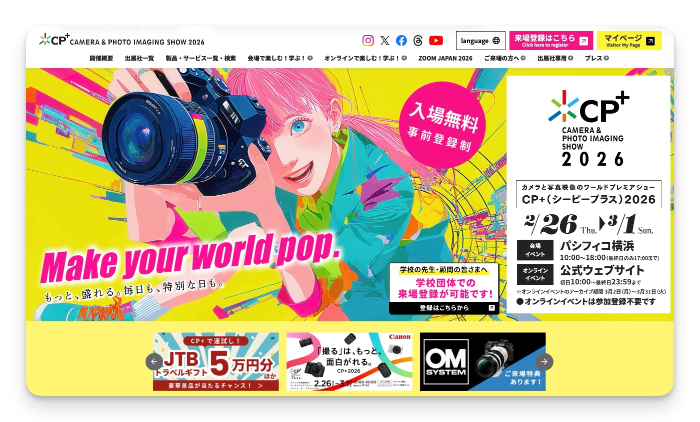 Sous le thème « Make Your World Pop », le salon affirme clairement sa vocation grand public autant que professionnelle : stands de prise en main, sessions de conférences, expositions photo, ateliers, un marché du ZINE, et même un studio dédié aux photos de peluches – phénomène culturel en plein essor au Japon.