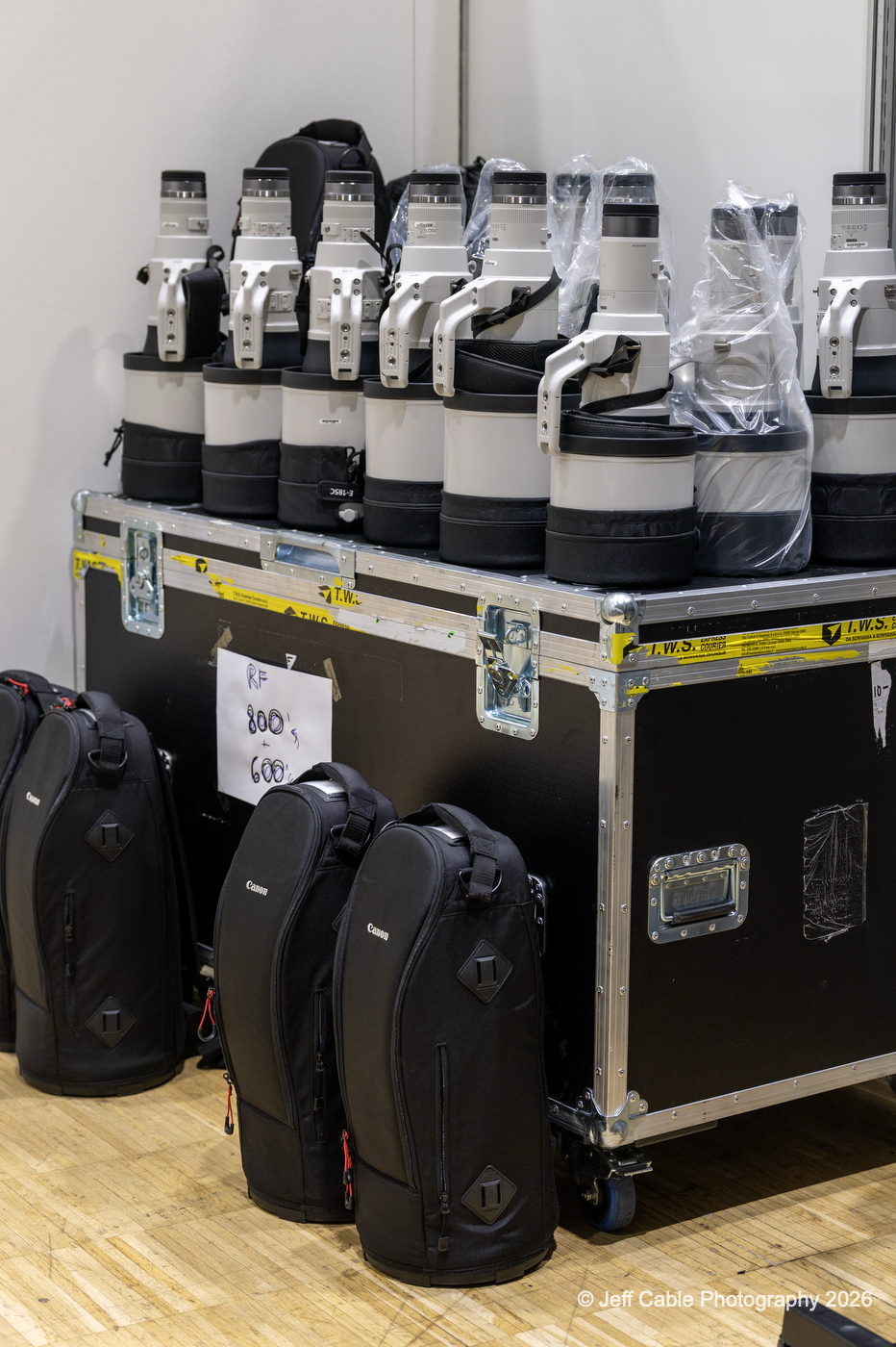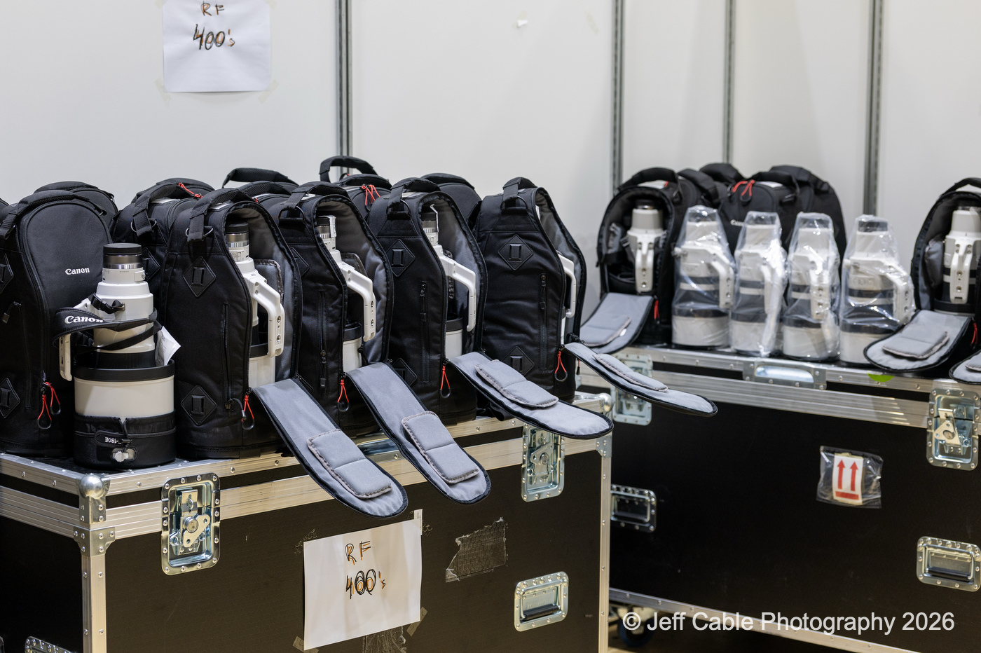 À côté des 800 mm, une belle réserve de RF 100-300 mm f/2,8 L IS USM est prête à être empruntée. Idem pour les RF 400 mm f/2,8 L IS USM, également présents en nombre, et qui constituent l’une des focales fixes de référence pour la photographie de sport en lumière difficile.