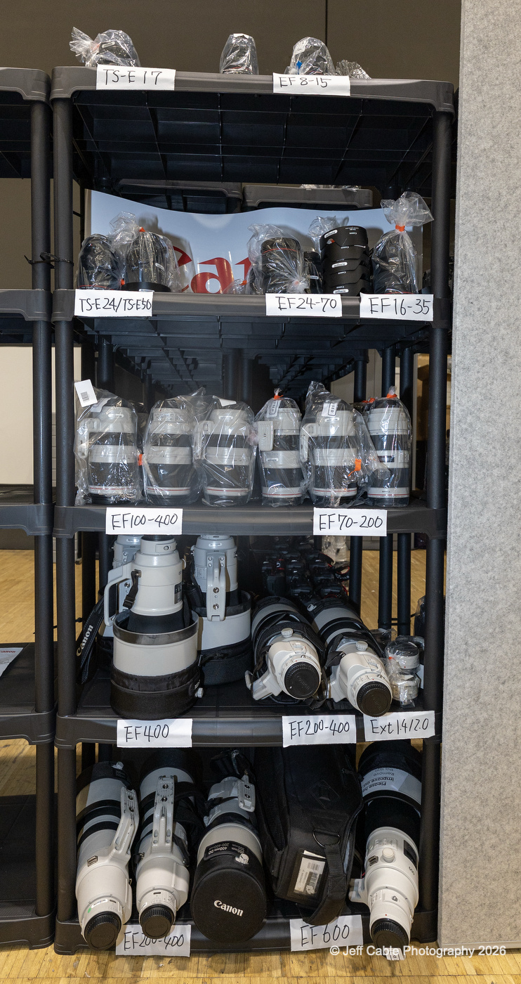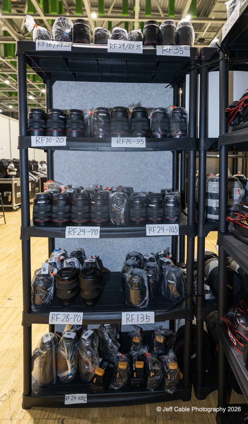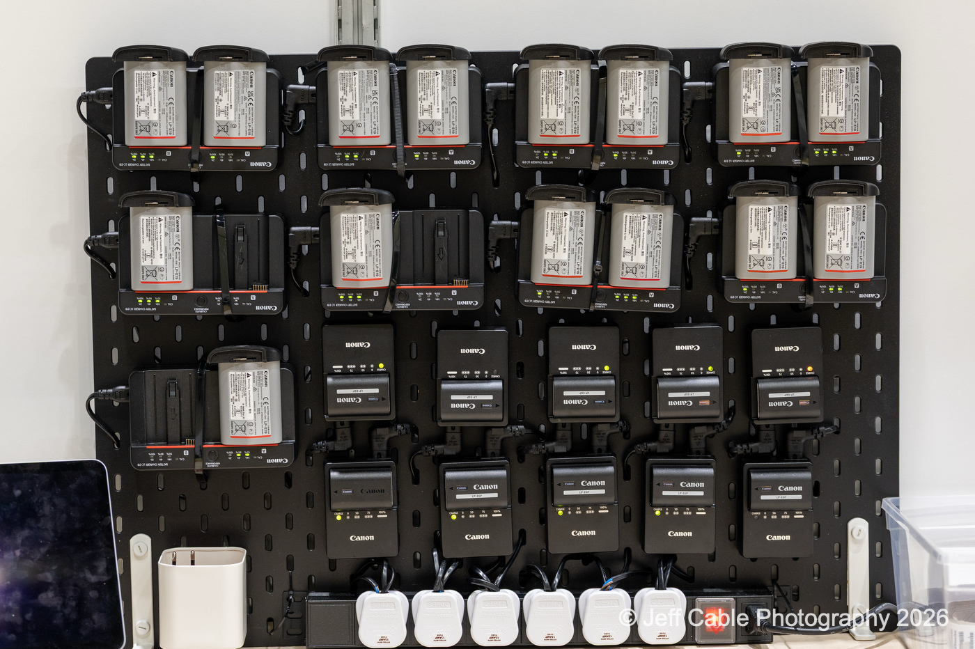 L’espace CPS va bien au-delà des objectifs. Des batteries pour les Canon R1 et R3 sont disponibles en très grande quantité, ainsi que des modèles compatibles avec les R5 Mark II et R6. Un mur entier de chargeurs permet de maintenir tous ces accumulateurs en charge en permanence, ce que Jeff Cable décrit avec humour comme son installation de rêve pour sa maison.