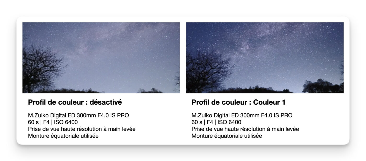 L’OM-3 Astro intègre des profils de couleur prédéfinis, accessibles via les modes personnalisés C1 à C3 du sélecteur de mode. Aussi, COLOR1 est optimisé pour l’astrophotographie de nébuleuses rouges, COLOR2 pour la photographie de paysages étoilés, selon le constructeur.
