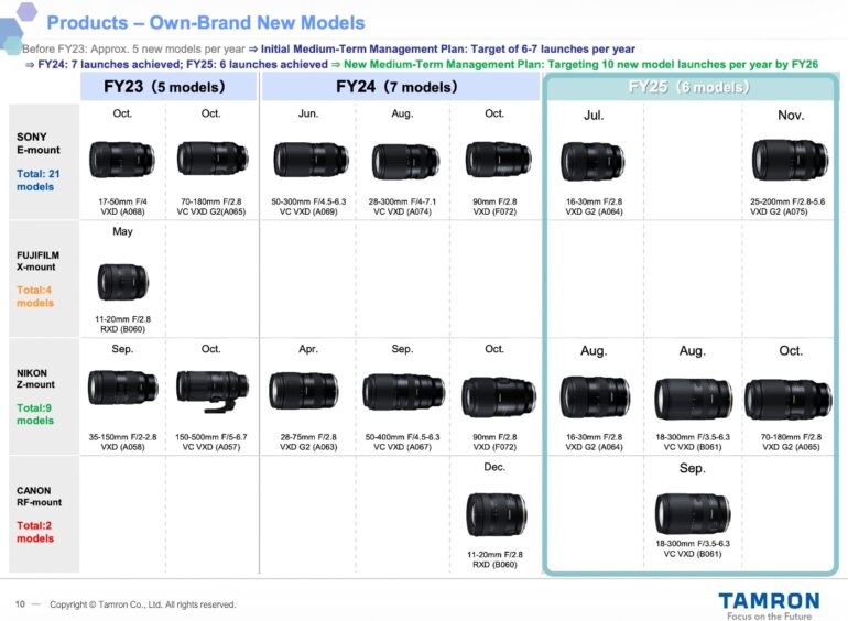 Dans ses résultats financiers FY2025 publiés début février, Tamron a révélé son plan pour 2026 : 10 nouveaux modèles, contre 6 en 2025. Le constructeur affiche ainsi de grandes ambitions, même s’il faut être attentif à la façon dont ces optiques sont décomptées.